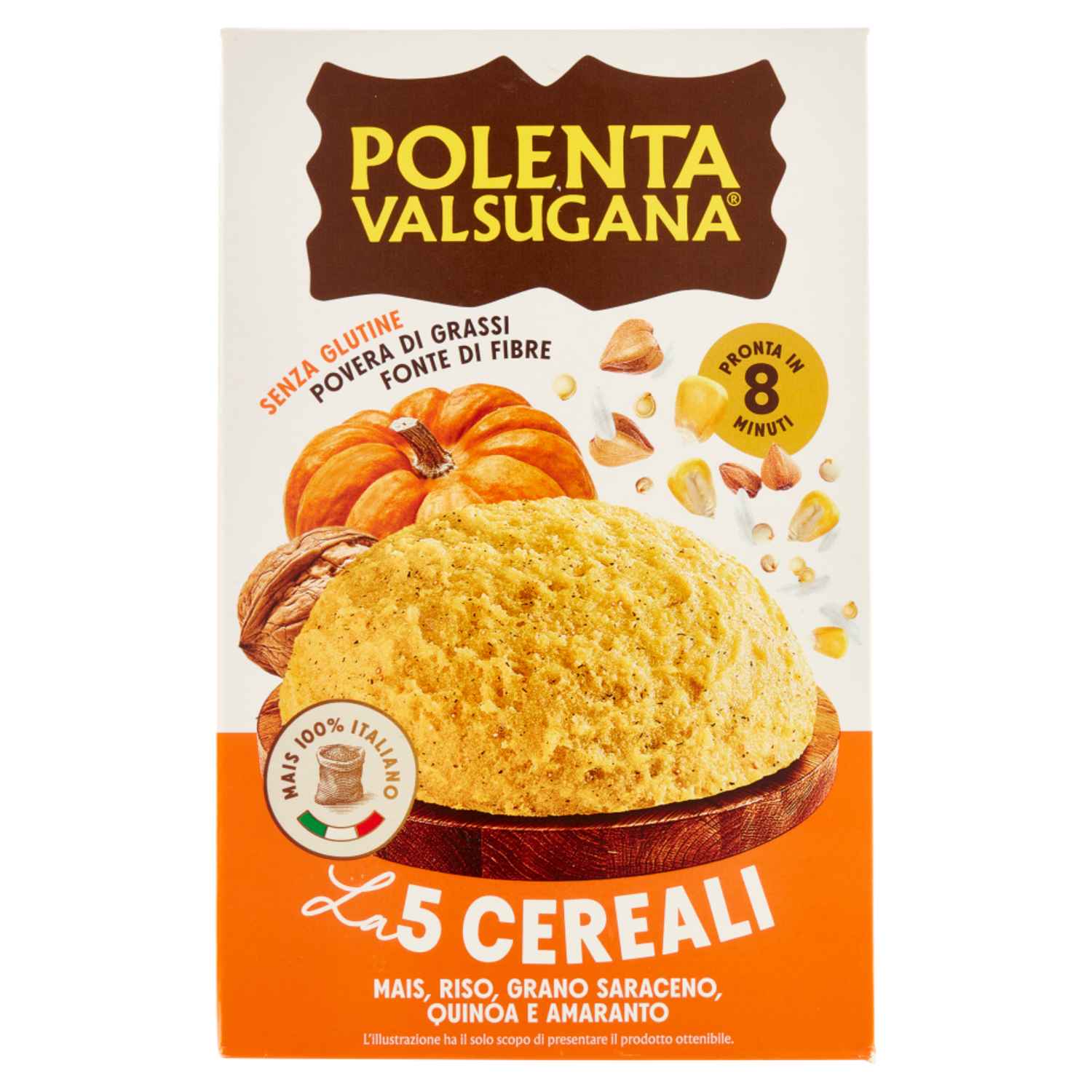 La bontà unica di Polenta Valsugana è il risultato di un lungo lavoro di ricerca della qualità delle materie prime e del rispetto dell'esclusivo metodo di doppia cottura a vapore del mais. Polenta Valsugana 5 Cereali è composta da farina di mais e un mix di cereali che la rendono unica nel gusto e perfetta per chi è attento ad un'alimentazione bilanciata. Senza glutine Il mais, il riso, il grano saraceno, la quinoa e l'amaranto sono naturalmente privi di glutine. Povera di grassi È povera in grassi e questo la rende perfetta per la preparazione di piatti gustosi e leggeri. Fonte di fibre Le fibre si trovano nello parte integrale del grano saraceno e sono preziose alleate per un'alimentazione equilibrata.