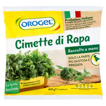 Le cime di rapa sono un ortaggio tipico del centro-sud Italia che Orogel coltiva in Basilicata e Puglia nei terreni più vocati dove, grazie al clima mite, si producono le migliori varietà. Dalla pianta di cime di rapa raccogliamo a mano solo la parte più pregiata, i germogli apicali e laterali, le cimette appunto. Ogni cimetta comprende il gambo che porta l'infiorescenza e le foglie più tenere. Il gambo è sottile nei germogli laterali, più grosso in quelli apicali, entrambi ugualmente gustosi e teneri. Con il loro sapore leggermente piccante e amarognolo, le Cimette di rapa si accompagnano bene con la carne di maiale e la pasta. Orogel con te! Per il tuo Benessere. Almeno 5 porzioni di verdura e frutta ogni giorno e un'alimentazione equilibrata, forniscono al tuo organismo tanti principi nutritivi e protettivi tipici dei vegetali. Insieme ad una vita sana e attiva, sono fondamentali per un buono stato di salute. Ricche di fibre e vitamina A che contribuisce a mantenere in buona salute la pelle e la visita e aiuta le normali funzioni del sistema immunitario. Orogel è alla costante ricerca delle scelte più sostenibili Questa busta è già di dimensioni e spessore ridotti al minimo Questo materiale conserva al meglio il prodotto al suo interno Busta Riciclabile Facile da smaltire nella raccolta della plastica Il suo riciclo darà vita a nuovi oggetti
