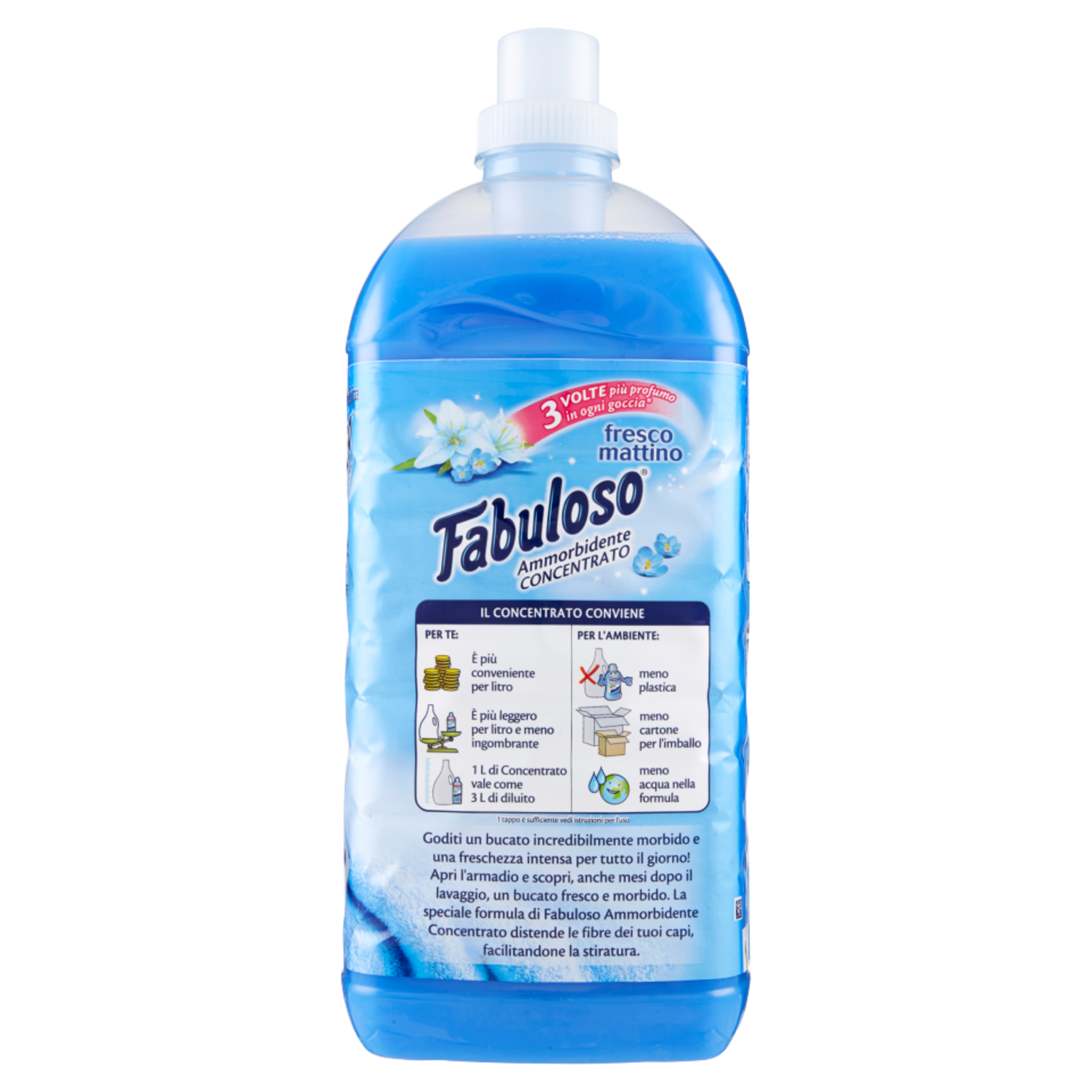 L'Ammorbidente Concentrato Fabuloso Fresco Mattino è un ammorbidente conveniente in quanto è più leggero per litro e meno ingombrante, 1L di concentrato vale come 3L di diluito. Inoltre, vengono impiegati meno plastica, meno acqua nella formula e meno cartone per l'imballo. Goditi un bucato incredibilmente morbido e una freschezza intensa per tutto il giorno! Apri l'armadio e scopri, anche mesi dopo il lavaggio, un bucato fresco e morbido. La speciale formula di Fabuloso Ammorbidente Concentrato distende le fibre dei tuoi capi, facilitandone la stiratura.