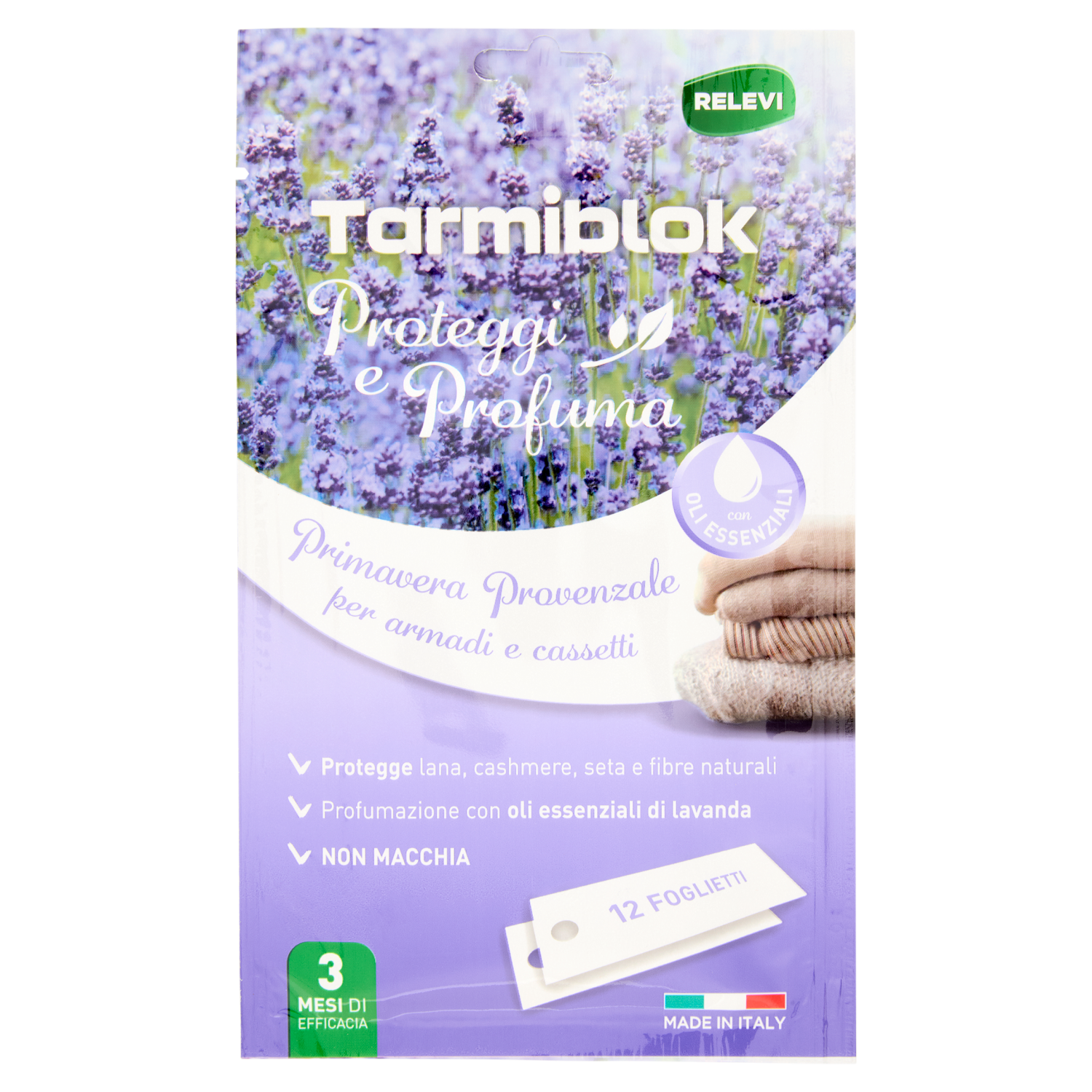Primavera provenzale con oli essenziali I foglietti Tarmiblok proteggono e profumano i capi che ami di più. La formulazione con oli essenziali di Lavanda regalano una gradevole profumazione primaverile ad armadi e cassetti.