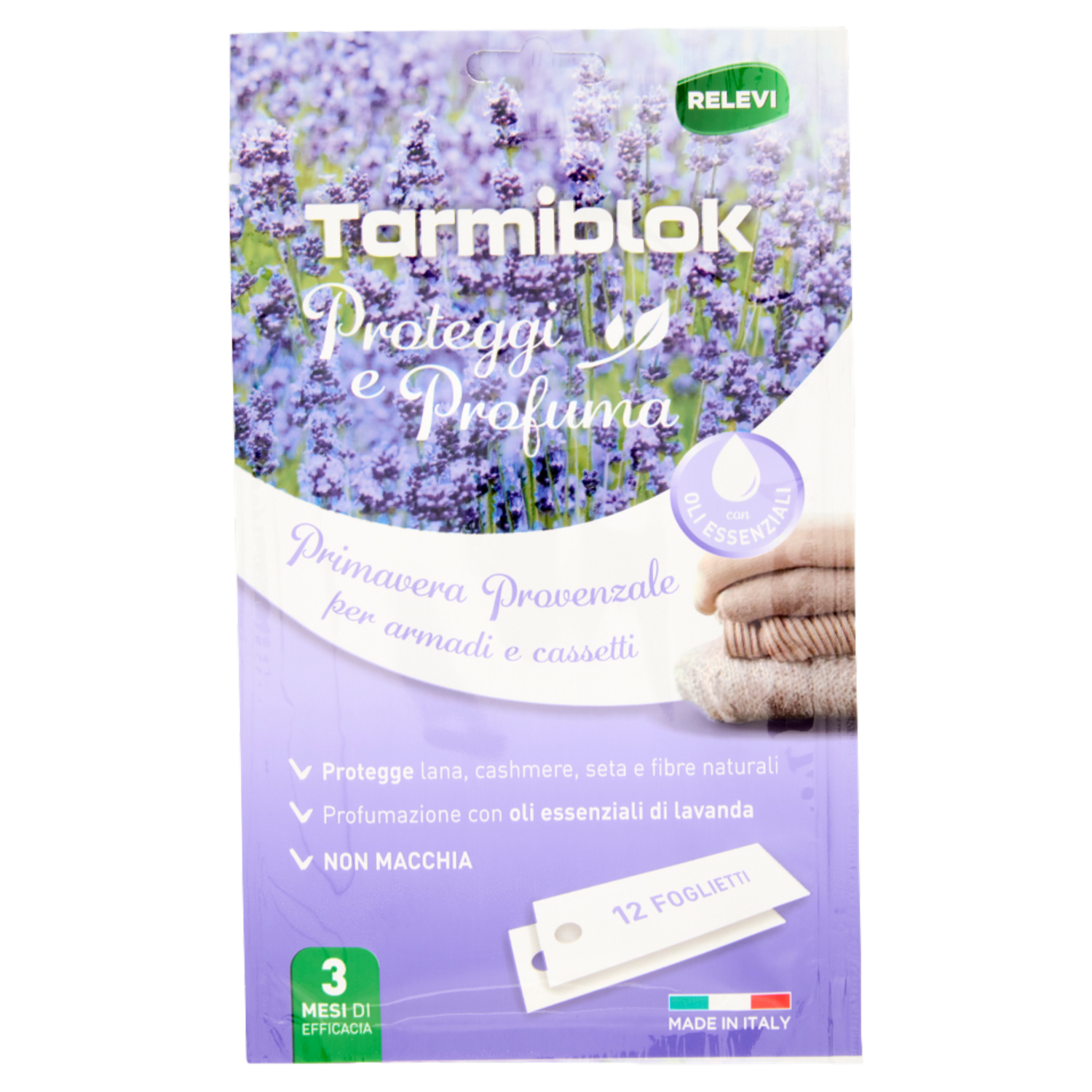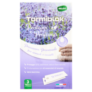 Primavera provenzale con oli essenziali I foglietti Tarmiblok proteggono e profumano i capi che ami di più. La formulazione con oli essenziali di Lavanda regalano una gradevole profumazione primaverile ad armadi e cassetti.