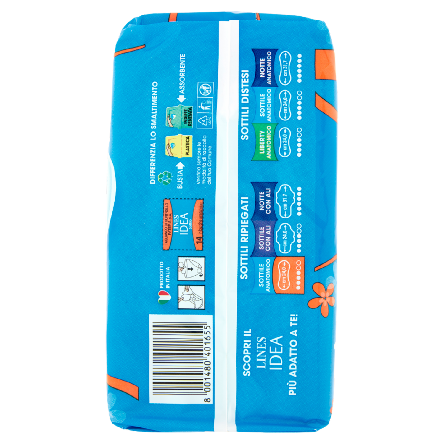 Vai su www.lines.it e troverai le risposte alle tue domande su: Sessualità - Ciclo mestruale - Ginecologia Ci impegniamo a costruire un futuro migliore Produzione sostenibile Abbiamo ridotto a Zero i Rifiuti inviati direttamente in discarica dalla nostra fabbrica L'80% dell'energia che utilizziamo nella nostra fabbrica proviene da Fonti Rinnovabili Trasporti sostenibili Negli ultimi anni abbiamo ridotto di oltre 5.000 tonnellate la CO2 emessa per trasportare tutti i nostri prodotti. Confezioni sostenibili Tutte le nostre confezioni Lines sono Riciclabili Scopri di più sul sito lines.it Seguici su Facebook, Instagram Scopri il Lines Idea più adatto a te! Sottili Ripiegati Sottile anatomico - cm 24,0 - Assorbenza 4 su 6 Sottile con ali - cm 24,0 - Assorbenza 4 su 6 Notte con ali - cm 31,7 - Assorbenza 6 su 6 Sottili Distesi Liberty anatomico - cm 24,0 - Assorbenza 4 su 6 Sottile anatomico - cm 24,0 - Assorbenza 4 su 6 Notte anatomico - cm 31,7 - Assorbenza 6 su 6