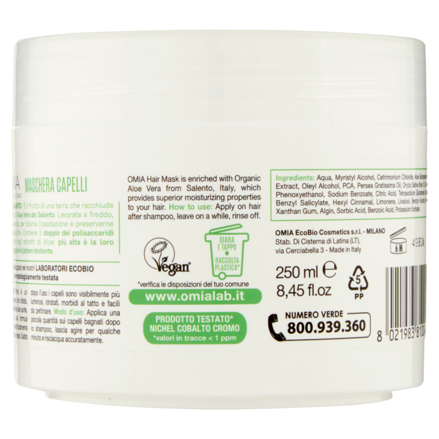 Aloe vera del Salento È il frutto di una terra che racchiude la forza di due mari: è l'Aloe Vera del Salento. Lavorata a freddo, entro 2 ore dalla raccolta, per ridurne l'ossidazione e preservarne intatti tutti i principi attivi. Contiene il doppio dei polisaccaridi mediamente presenti negli estratti di Aloe: più alta è la loro concentrazione, maggiore è il potere idratante. Formulata e sviluppata nei nostri Laboratori Ecobio Dermatologicamente testata La Maschera Capelli Omia è un condizionante a risciacquo che idrata, nutre e ristruttura i capelli fino alle punte, senza appesantirli. La sua formula riparatrice intensiva è specificatamente studiata per capelli secchi e crespi. Subito dopo l'uso i capelli sono visibilmente più luminosi, idratati, morbidi al tatto e facili da pettinare. Prodotto testato* Nichel Cobalto Cromo *valori in tracce < 1 ppm