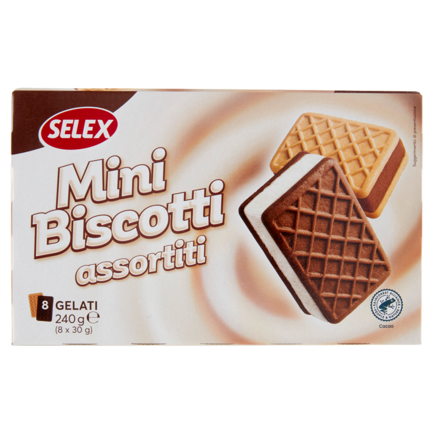 8 Gelati con biscotti: 4 al gusto di vaniglia e 4 al cioccolato Minibiscotto con gelato al gusto di vaniglia Minibiscotto con gelato al cioccolato