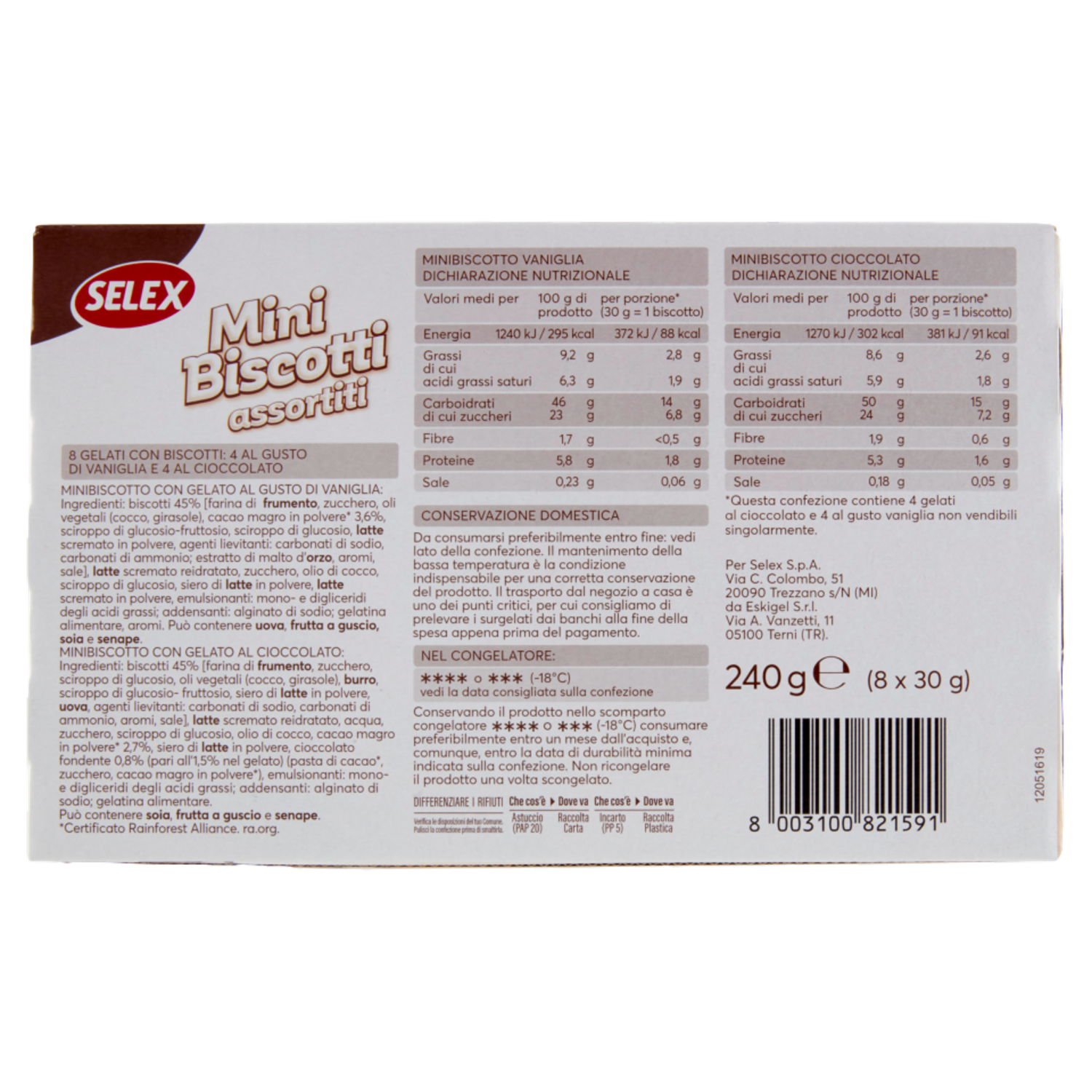 8 Gelati con biscotti: 4 al gusto di vaniglia e 4 al cioccolato Minibiscotto con gelato al gusto di vaniglia Minibiscotto con gelato al cioccolato
