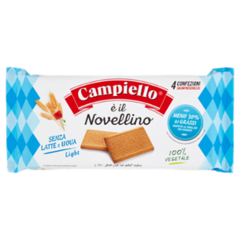Il Novellino Campiello Senza Latte e Uova - Light Campiello "Senza Latte e Uova" è il classico Novellino Campiello in versione "alleggerita" ma altrettanto gradevole: una ricetta esclusiva che unisce al ridotto contenuto di grasso (30% in meno rispetto alla media dei frollini) l'assenza di latte e di uova, senza modificarne né la friabilità né il gusto. Il biscotto mantiene inalterate le apprezzate qualità di consistenza fine e leggera, di forma sottile e di aspetto artigianale, tipiche del Novellino Campiello: un prodotto inimitabile derivante dalla combinazione di una ricetta storica e di tradizionali ed esclusivi metodi di lavorazione. 100% Vegetale
