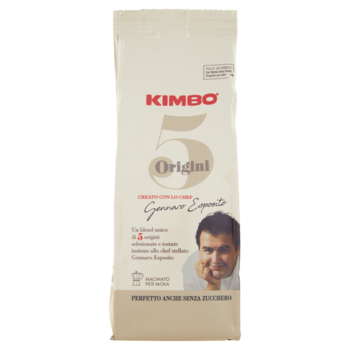 5 Origini - Etiopia - Guatemala - Brasile - Colombia - Costa Rica Valvola svela aroma Premila e lasciati avvolgere dal profumo del caffè come appena macinato Nella smorfia napoletana cinque è il numero che rappresenta la mano. In questa storia le mani sono due: quella di Gennaro Esposito, chef che ha fatto della ricerca delle migliori materie prime un marchio di fabbrica e quella di Kimbo che ha reso il caffè napoletano celebre nel mondo. Dalla stretta di mano di queste due eccellenze campane nasce Kimbo 5 Origini: un blend delle migliori qualità di caffè Arabica, attentamente selezionate da Gennaro Esposito e tostate sapientemente dai mastri torrefattori di Kimbo. Un caffè napoletano contemporaneo, come un piatto stellato di Gennaro: estroso ma equilibrato, sorprendente e coinvolgente, intenso come un viaggio nella cultura del caffè di Napoli. Creato con lo chef Gennaro Esposito Profilo sensoriale Aroma 6 su 6 Corpo 5 su 6 Tostatura 3 su 6 Intensità 10