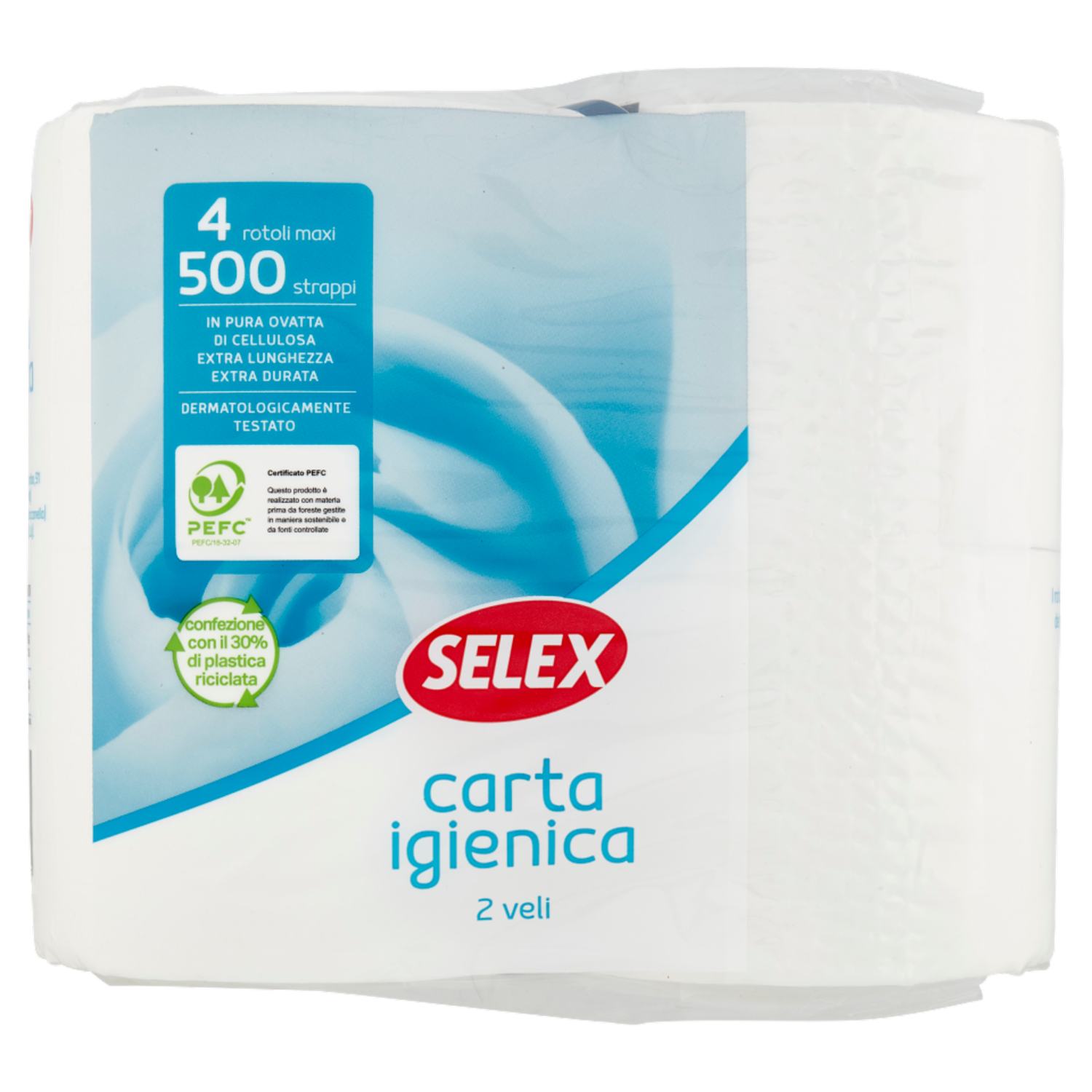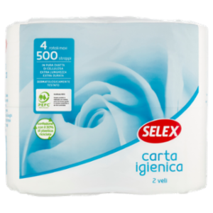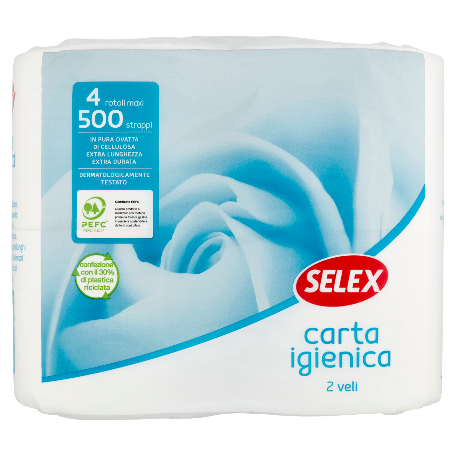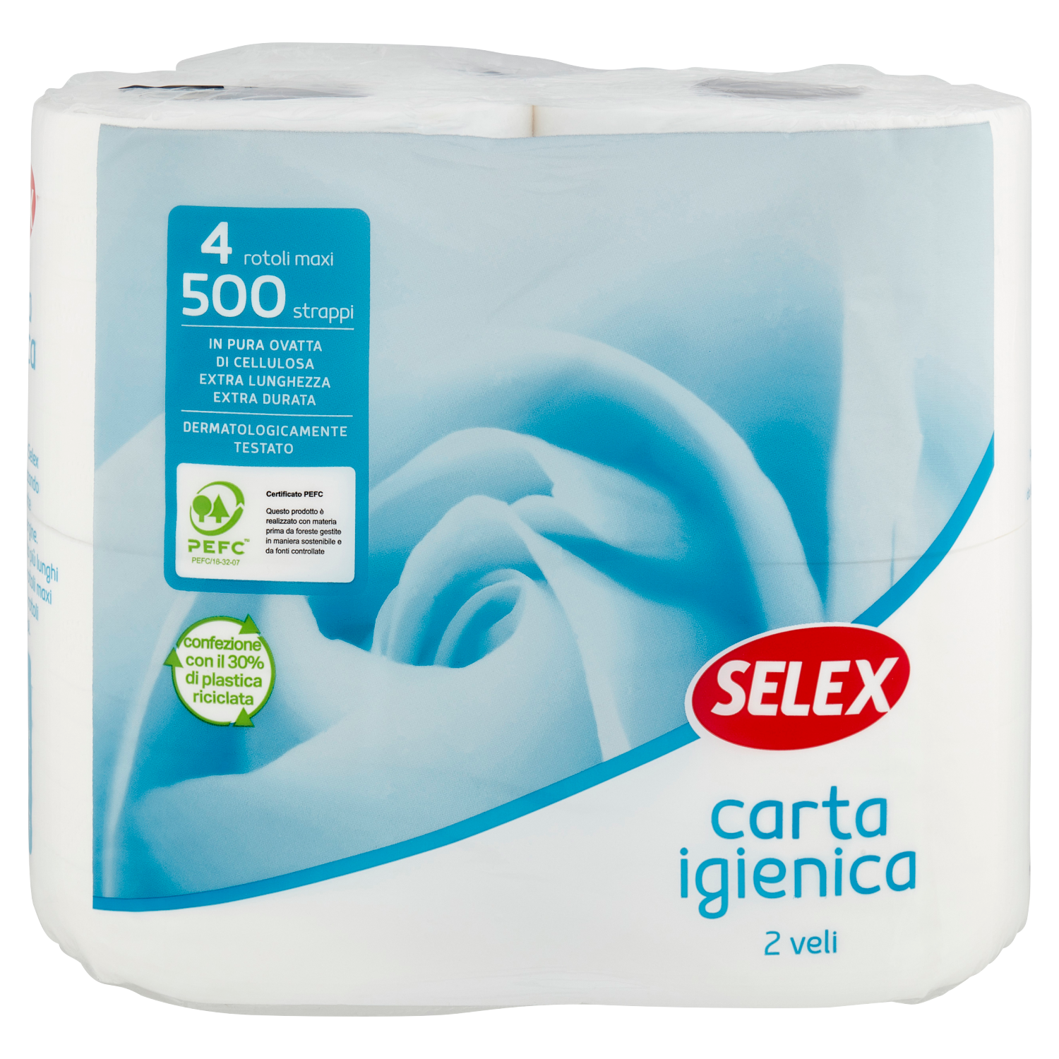 La Carta Igienica Selex è realizzata utilizzando esclusivamente pura cellulosa vergine. I rotoli maxi sono molto più lunghi dei normali rotoli: 4 rotoli maxi equivalgono a 10 rotoli da 200 strappi.