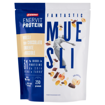 Fantastic Muesli con Cioccolato Fondente e Nocciole L'importanza delle proteine Le proteine contribuiscono al mantenimento della massa muscolare. Enervit ti consiglia di seguire una dieta variata ed equilibrata e uno stila di vita sano e di praticare attività fisica regolarmente. Ricco di Proteine - 31,0 g su 100 g di prodotto con Proteine da Soia, da Avena, da Farro