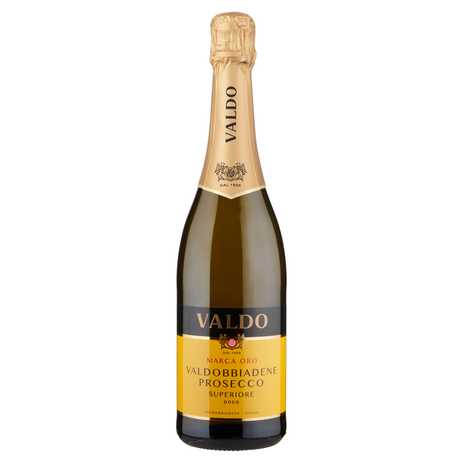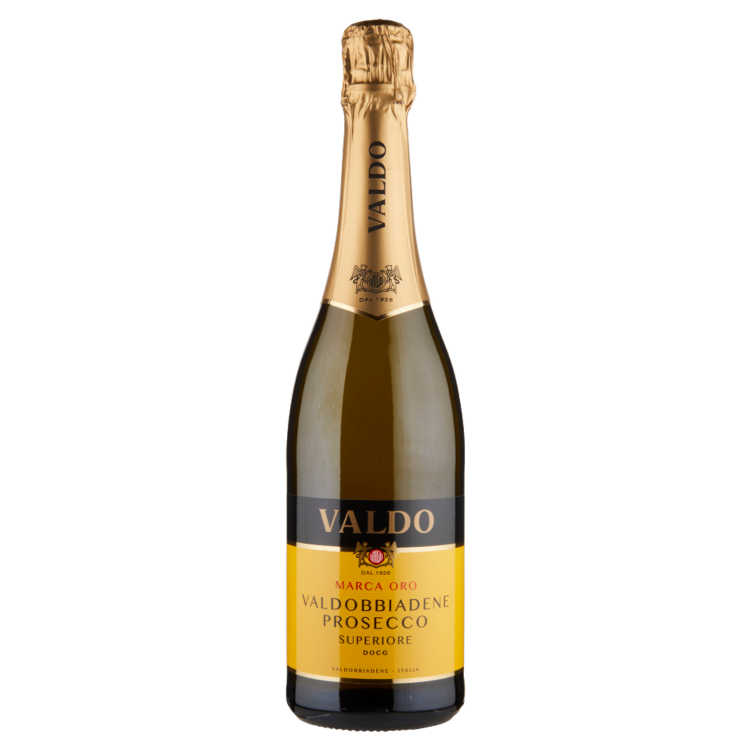 Marca Oro Valdobbiadene Prosecco Superiore DOCG Extra Dry, vino bianco spumante extra dry italiano. Caratteristiche: Colore giallo paglierino con riflessi dorati. Delicato profumo di mela selvatica, fiori d'acacia e miele. Al palato morbido, gentile e con un fine perlage. Valdobbiadene Prosecco Superiore Denominazione di Origine Controllata e Garantita