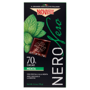 Nero Nero 70% con con cristalli di menta. L'unione inimitabile di un grande cioccolato con la raffinatezza del miglior olio essenziale di menta. Senza glutine