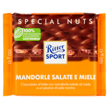 Cioccolato al latte extra con mandorle tostate e salate con copertura al miele (25%). Cacao: 30% minimo nel cioccolato al latte