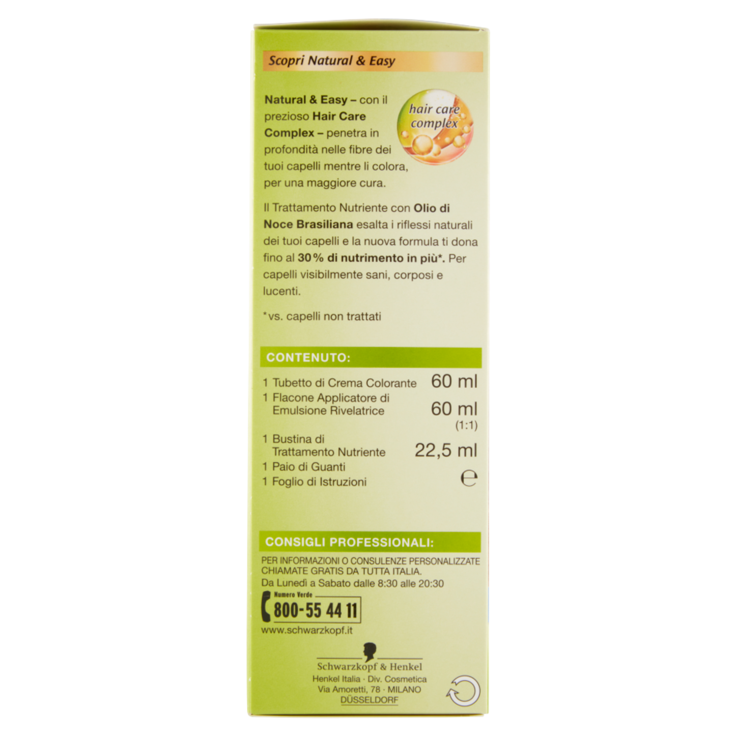 Colori trattamento naturali ed intensi Come ottenere riflessi naturali e multi-tono? Il colore naturale è il risultato di diversi toni e sfumature. Questo è ciò che lo rende così intenso e luminoso. Natural & Easy fa lo stesso: tre tonalità di colore accuratamente armonizzate sono già pre-miscelate per donarti un risultato colore naturale, ricco di riflessi luminosi. Perchè Natural & Easy è così nutriente? Natural & Easy - arricchito con il prezioso olio di primula - nutre i capelli, donando fino al 30% di nutrimento in più*! Perchè solo con capelli nutriti e sani il colore risulta incredibilmente luminoso. Natural & Easy copre i miei capelli bianchi a lungo? Si! Natural & Easy copre perfettamente i capelli bianchi e ti dona un colore luminoso, ricco di riflessi e che dura a lungo! Scopri Natural & Easy Natural & Easy - con il prezioso Hair Care Complex - penetra in profondità nelle fibre dei tuoi capelli mentre li colora, per una maggiore cura. Il Trattamento Nutriente con Olio di Noce Brasiliana esalta i riflessi naturali dei tuoi capelli e la nuova formula ti dona fino al 30% di nutrimento in più*. Per capelli visibilmente sani, corposi e lucenti. *vs. capelli non trattati