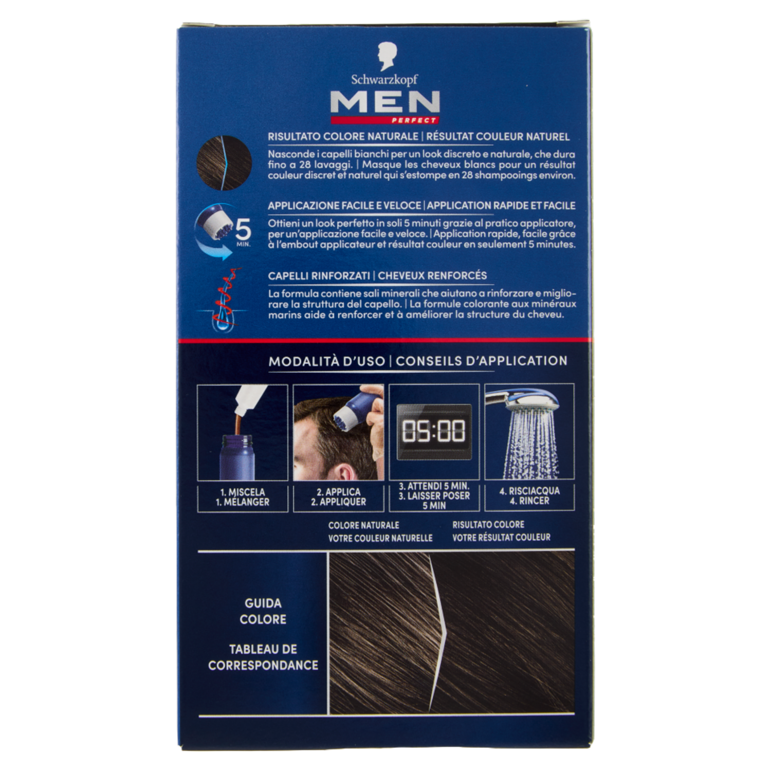 Risultato colore 100% naturale - Specificamente per l'uomo Men Perfect è un colorante in gel delicato e facile da usare che nasconde i capelli bianchi in un modo naturale e discreto. Applicato con l'applicatore veloce brevettato da Schwarzkopf, la formula rinfresca il tuo colore dei capelli e li rinforza. Dura fino a 28 shampoo. Risultato veloce ed efficace - In soli 5 minuti Il tempo di posa e il risultato colore dipende dalla quantità di capelli bianchi. Per i primi capelli bianchi 5 min. (fino al 10%) Per molti capelli bianchi 10 min. (fino al 50%) Formula energizzante con mineral complex La formula di Men Perfect contiene sali minerali che aiutano a rinforzare e migliorare la struttura del capello. Elimina i capelli bianchi - rinfresca il tuo colore di capelli in un modo incredibilmente rapido e facile con Men Perfect. Applicazione in 5 minuti Risultato naturale raggiunto velocemente grazie all'applicatore facile da usare