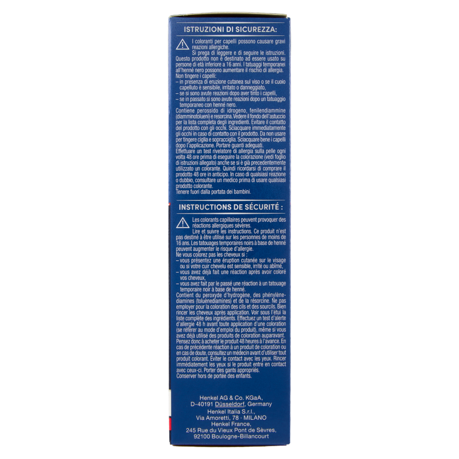 Può causare reazione allergica - Seguire le istruzioni di sicurezza. ISTRUZIONI DI SICUREZZA: I coloranti per capelli possono causare gravi reazioni allergiche. Si prega di leggere e di seguire le istruzioni. Questo prodotto non è destinato ad essere usato su persone di età inferiore a 16 anni. I tatuaggi temporanei all'henné nero possono aumentare il rischio di allergia. Non tingere i capelli: - in presenza di eruzione cutanea sul viso o se il cuoio capelluto è sensibile, irritato o danneggiato; - se si sono avute reazioni dopo avere tinto i capelli; - se in passato si sono avute reazioni dopo un tatuaggio temporaneo con henné nero. Contiene perossido di idrogeno, fenilendiammine (diamminotolueni) e resorcina. Vedere il fondo dell'astuccio per la lista completa degli ingredienti. Evitare il contatto del prodotto con gli occhi. Se il prodotto viene a contatto con gli occhi, sciacquarli immediatamente. Da non usare per tingere ciglia e sopracciglia. Sciacquare bene i capelli dopo l'applicazione. Portare guanti adeguati. Effettuare un test rivelatore di allergia sulla pelle ogni volta 48 ore prima di eseguire la colorazione (guardare il foglietto allegato), anche se si è già precedentemente utilizzato un colorante. Quindi ricordarsi di comprare il prodotto 48 ore in anticipo. In caso di qualsiasi reazione o dubbio, consultare un medico prima di usare qualsiasi prodotto colorante. Tenere fuori dalla portata dei bambini.
