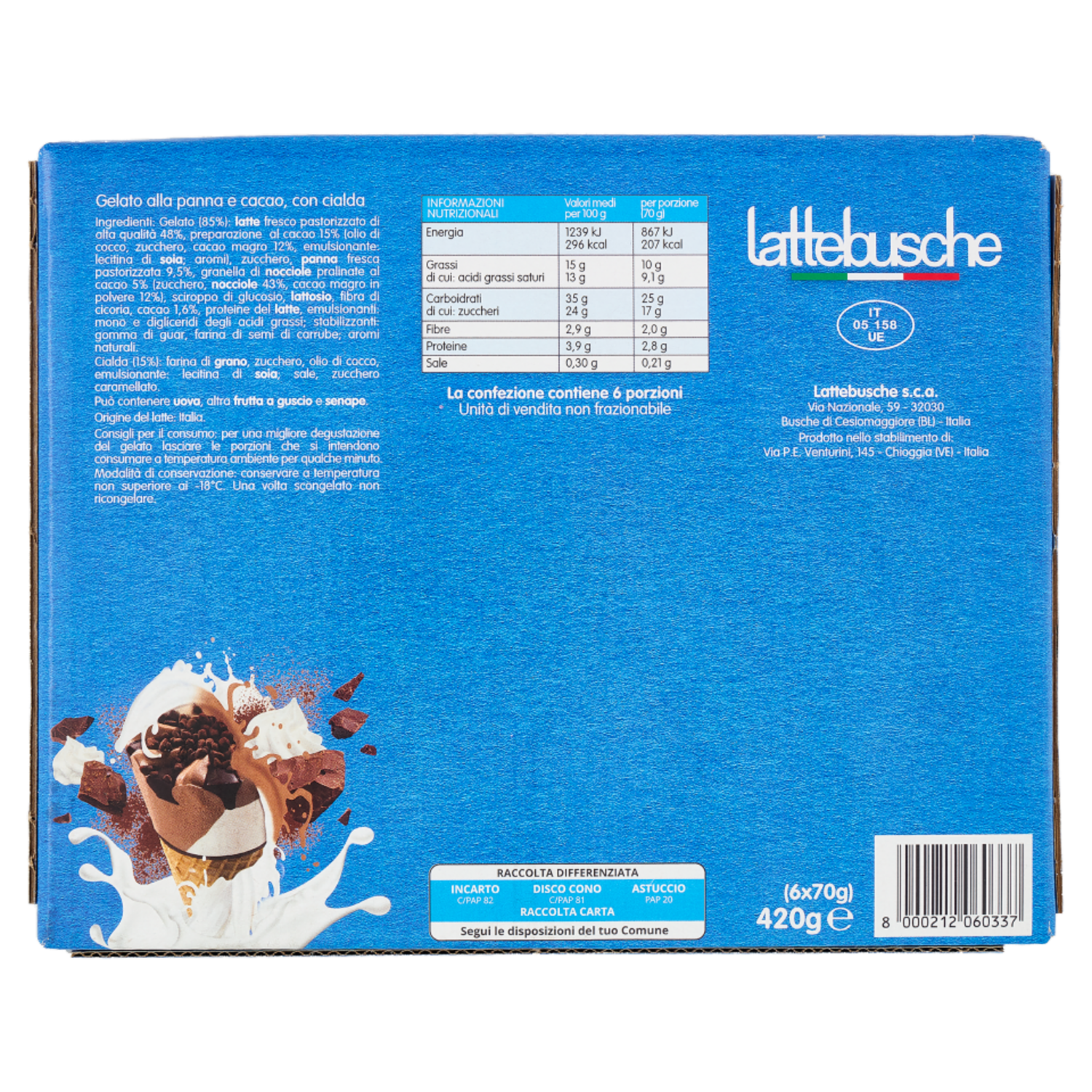 Gelato (85%): latte fresco pastorizzato di alta qualità 48%, preparazione al cacao 15% (olio di cocco, zucchero, cacao magro in polvere 13% della preparazione pari al 2% del gelato, emulsionante: lecitina di soia; aromi), zucchero, panna fresca pastorizzata 10%, granella di nocciole pralinate al cacao 5% (zucchero, nocciole 43% della granella pari al 2% del gelato, cacao magro in polvere 12% della granella pari all'1% del gelato), sciroppo di glucosio, lattosio, fibra di cicoria, cacao 2%, proteine del latte, emulsionanti: mono e digliceridi degli acidi grassi; stabilizzanti: gomma di guar, farina di semi di carrube; aromi naturali