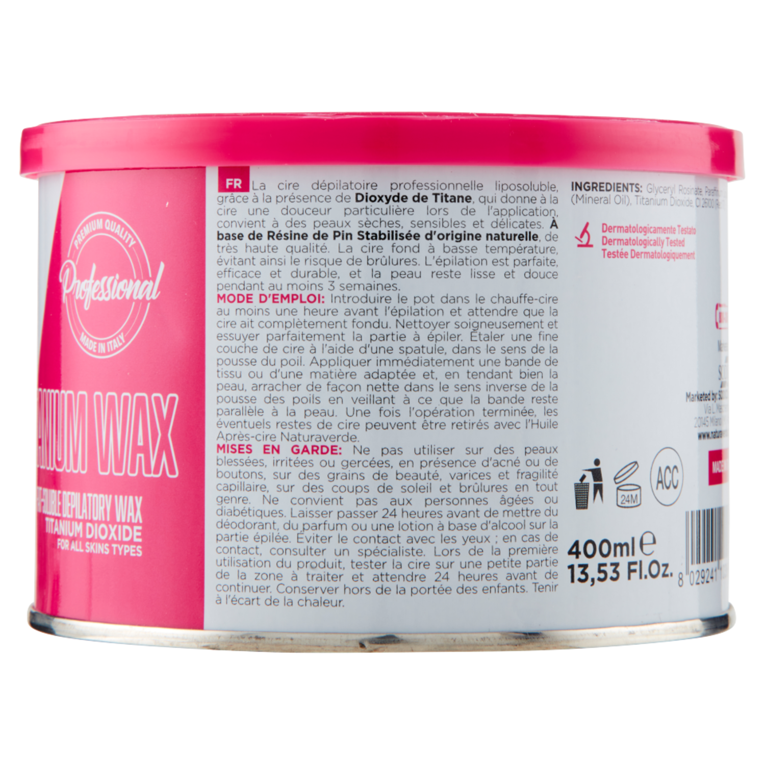 AVVERTENZE: Non usare su pelli con ferite, irritate o screpolate, con acne o brufoli, su nei, vene varicose e fragilità capillare, su bruciature solari e di altro genere. Non adatto a persone anziane o diabetiche. Attendere 24 ore prima di applicare deodorante, profumo o lozione alcoolica sulla parte depilata. Evitare il contatto con gli occhi; nel caso consultare uno specialista. Se il prodotto viene usato per la prima volta, testate la cera su una piccola parte dell'area che si desidera trattare ed attendere 24 ore prima di procedere. Tenere fuori dalla portata dei bambini. Conservare lontano da fonti di calore.
