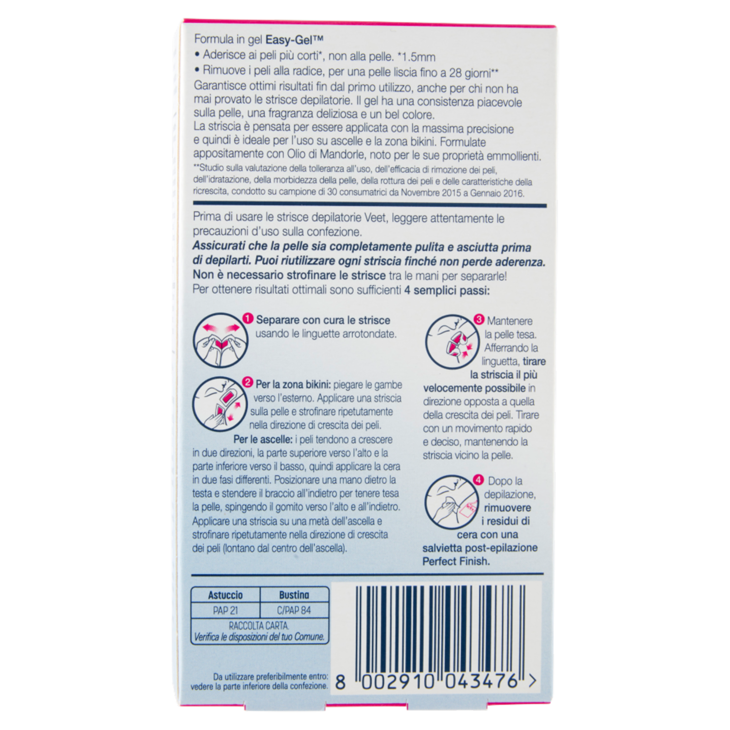 Formula in gel Easy-Gel: - Aderisce ai peli più corti*, non alla pelle. - Rimuove i peli alla radice, per una pelle liscia fino a 28 giorni.** Garantisce ottimi risultati fin dal primo utilizzo, anche per chi non ha mai provato le strisce depilatorie. Inoltre il gel ha una consistenza piacevole sulla pelle, una fragranza deliziosa e un bel colore. Appositamente formulata con Olio di Mandorle e profumo di Fiordaliso, noti per il loro effetto benefico sulla pelle sensibile. *1,5mm **Studio sulla valutazione della tolleranza all'uso, dell'efficacia di rimozione dei peli, dell'idratazione, della morbidezza della pelle, della rottura dei peli e delle caratteristiche della ricrescita, condotto su campione di 30 consumatrici da Novembre 2015 a Gennaio 2016.