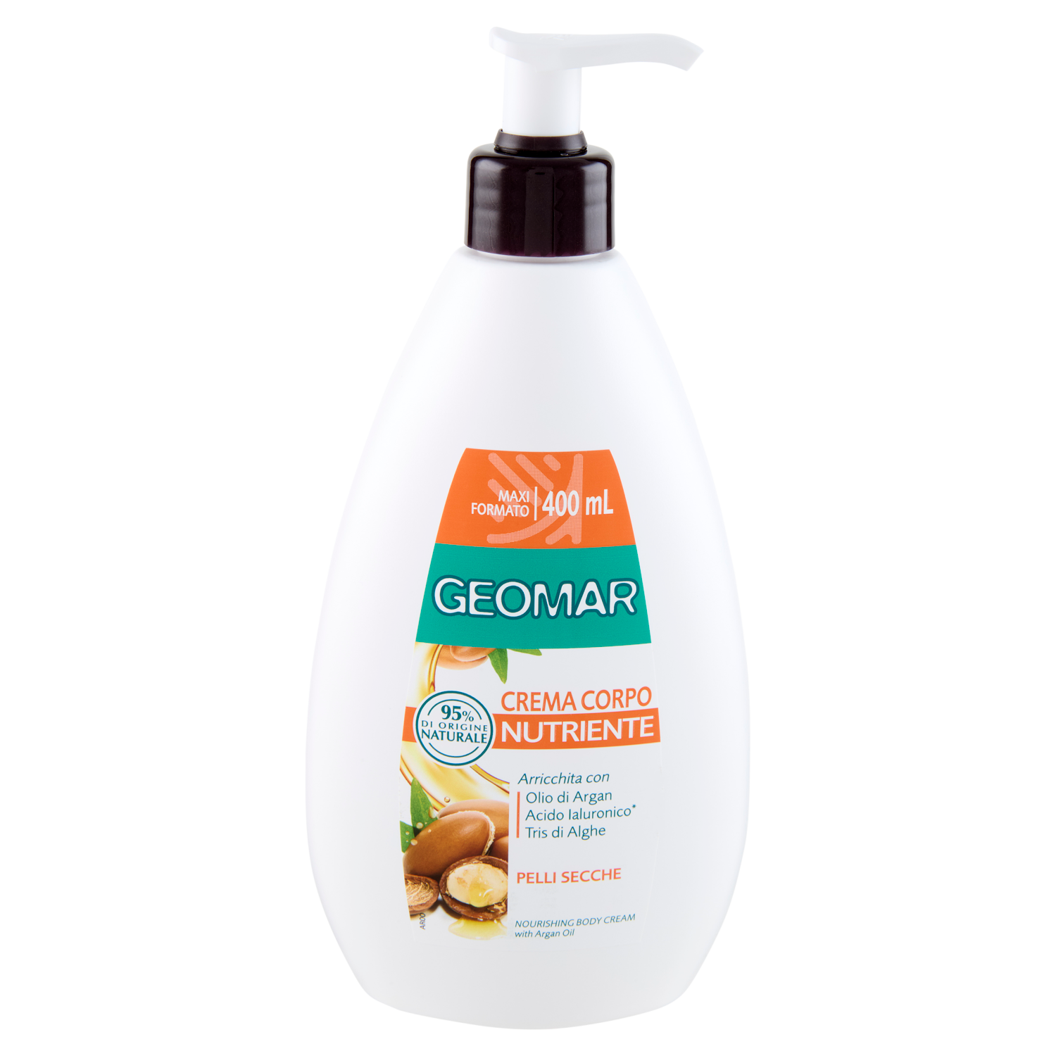 La Crema Corpo Nutriente Geomar con il 95% di ingredienti di origine naturale (Olio di Argan, Acido Ialuronico*, Tris di Alghe e Oligoelementi del Mar Morto) lascia la pelle nutrita e vellutata senza ungere. Formula ricca dal nutrimento intenso: una vera e propria coccola dalla profumazione calda e avvolgente. Applicala ogni giorno su tutto il corpo e massaggia delicatamente fino a completo assorbimento. Particolarmente adatta in caso di pelle secca e/o molto secca. Dermatologicamente testata. *di origine vegetale.