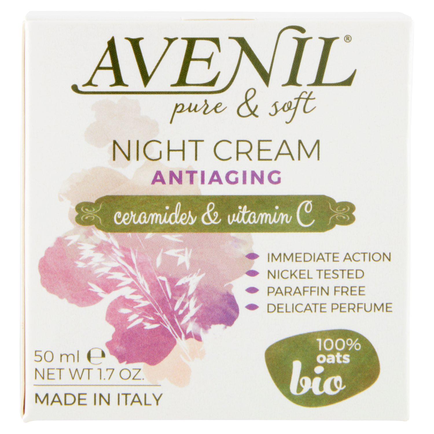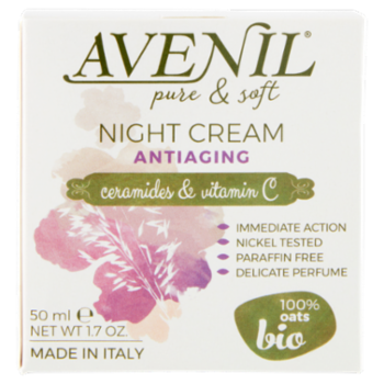 La Crema Antietà specifica per la Notte Avenil Pure & Soft con Ceramidi, Vitamina C e Avena* è stata formulata per contrastare l'insorgenza di piccole rughe. L'attenta ed innovativa formulazione agisce durante il riposo notturno per ristabilire il naturale equilibrio della pelle più stressata ed atona, restituendole morbidezza e tonicità. Per aumentarne l'efficacia se ne consiglia l'uso quotidiano in abbinamento con la crema Giorno Antietà Avenil. * Formula con avena proveniente da agricoltura biologica Dermatologicamente testato.