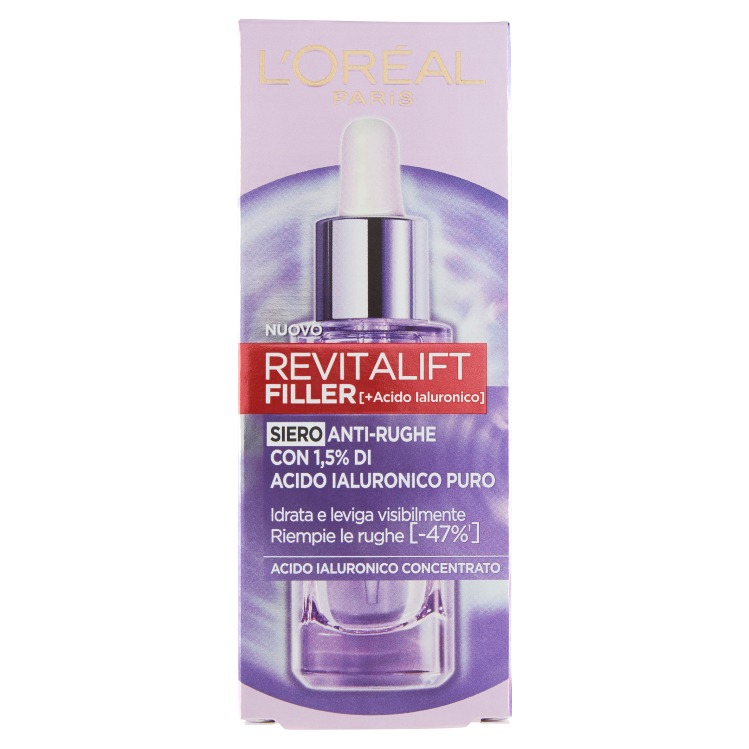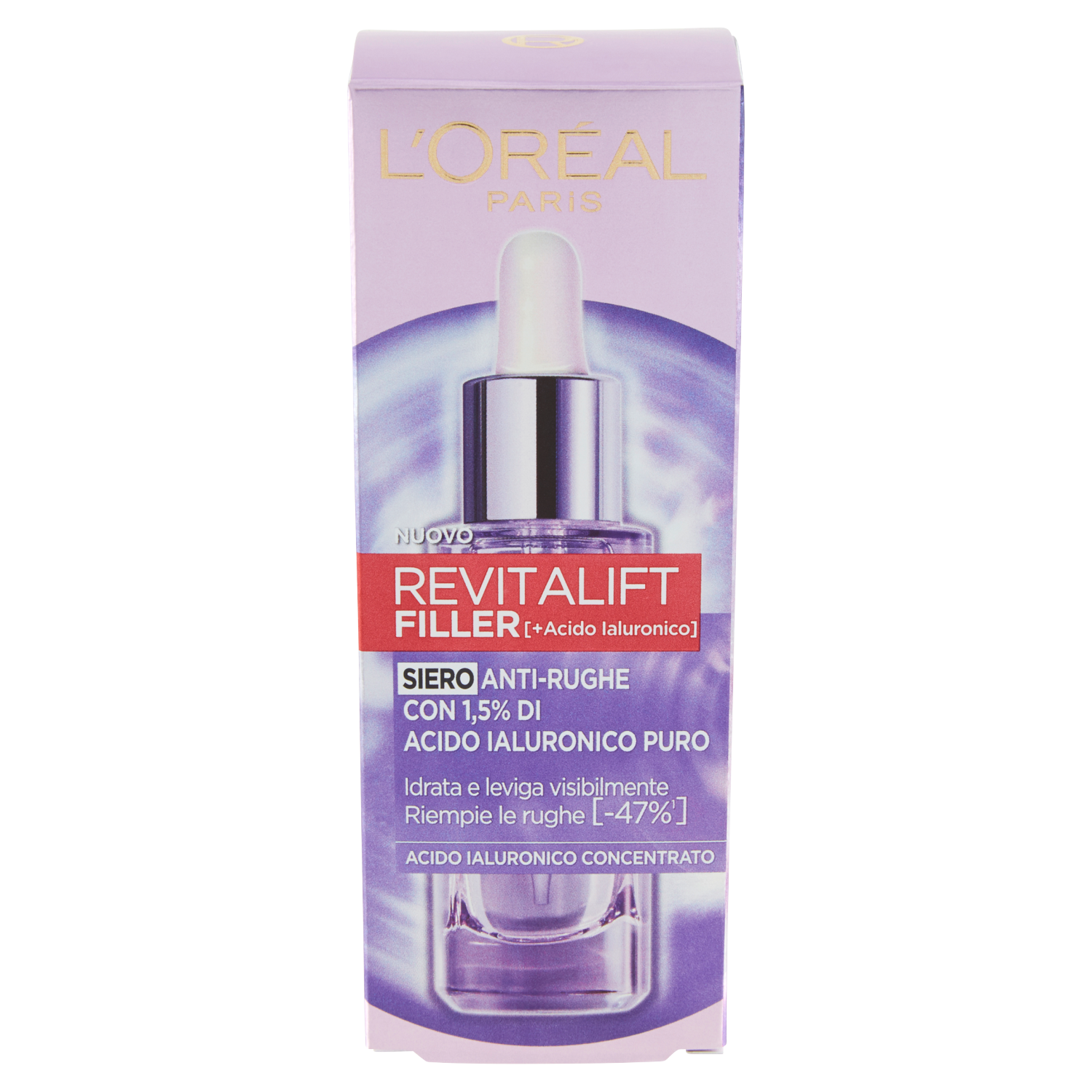 Il siero in pipetta Filler è arricchito di 1,5% di acido ialuronico. Uno shot ultra concentrato di acido ialuronico per riempire tutti i tipi di rughe, reidratando istantaneamente e rendendo la pelle visibilmente più liscia. Risultato: -47% di rughe in 6 settimane *Punteggio clinico- 53 donne