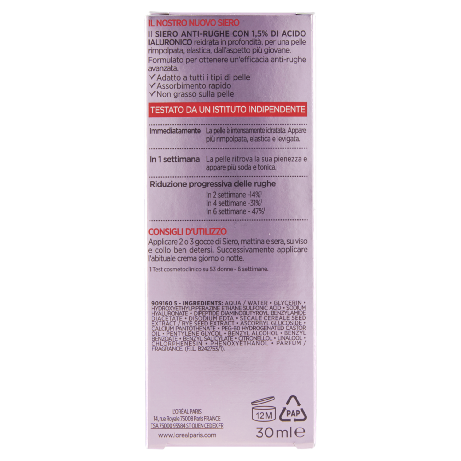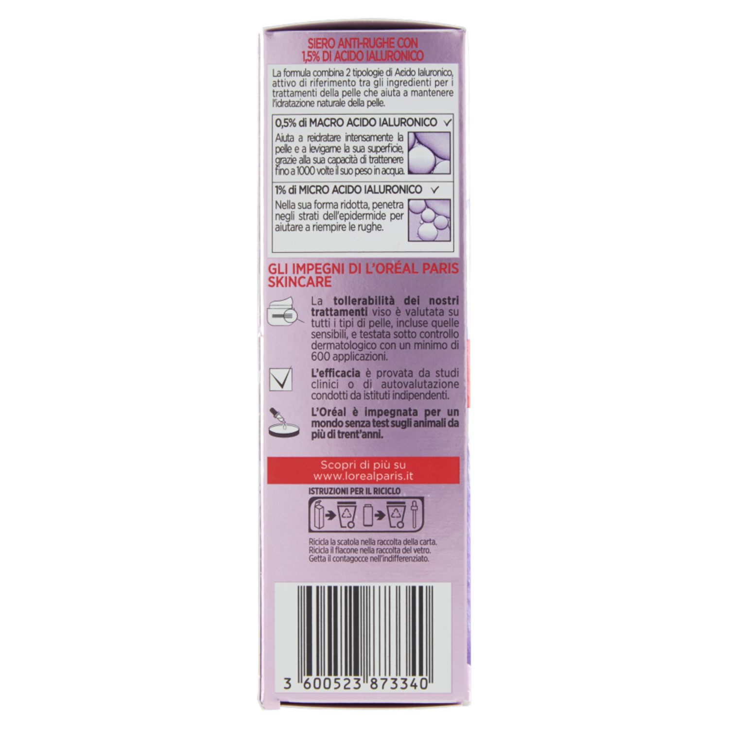Gli impegni di L'Oréal Paris Skincare La tollerabilità dei nostri trattamenti viso è valutata su tutti i tipi di pelle, incluse quelle sensibili, e testata sotto controllo dermatologico con un minimo di 600 applicazioni. L'efficacia è provata da studi clinici o di autovalutazione condotti da istituti indipendenti. L'Oréal è impegnata per un mondo senza test sugli animali da più di trent'anni. Scopri di più su www.lorealparis.it