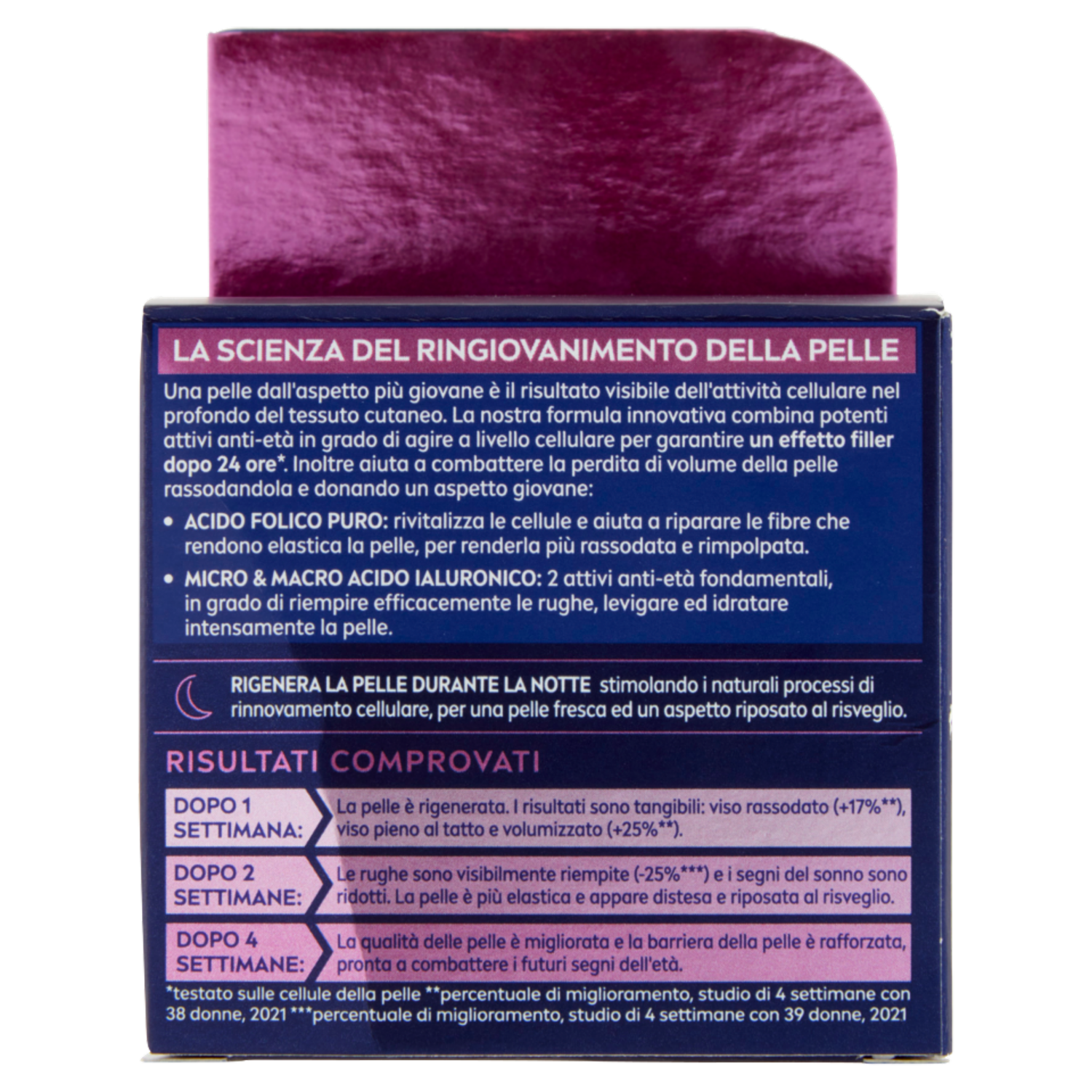 La scienza del ringiovanimento della pelle Una pelle dall'aspetto più giovane è il risultato visibile dell'attività cellulare nel profondo del tessuto cutaneo. La nostra formula innovativa combina potenti attivi anti-età in grado di agire a livello cellulare per garantire un effetto filler dopo 24 ore*. Inoltre aiuta a combattere la perdita di volume della pelle rassodandola e donando un aspetto giovane: - Acido Folico Puro: rivitalizza le cellule e aiuta a riparare le fibre che rendono elastica la pelle, per renderla più rassodata e rimpolpata. - Micro & Macro Acido Ialuronico: 2 attivi anti-età fondamentali, in grado di riempire efficacemente le rughe, levigare ed idratare intensamente la pelle. *testato sulle cellule della pelle Rigenera La Pelle Durante La Notte stimolando i naturali processi di rinnovamento cellulare, per una pelle fresca ed un aspetto riposato al risveglio. Risultati comprovati Dopo 1 Settimana: La pelle è rigenerata. I risultati sono tangibili: viso rassodato (+17%**), viso pieno al tatto e volumizzato (+25%**). Dopo 2 Settimane: Le rughe sono visibilmente riempite (-25%***) e i segni del sonno sono ridotti. La pelle è più elastica e appare distesa e riposata al risveglio. Dopo 4 Settimane: La qualità delle pelle è migliorata e la barriera della pelle è rafforzata, pronta a combattere i futuri segni dell'età. **percentuale di miglioramento, studio di 4 settimane con 38 donne, 2021 ***percentuale di miglioramento, studio di 4 settimane con 39 donne, 2021 Micro & macro acido ialuronico Acido folico puro Compatibilità cutanea Dermatologicamente Comprovata Delicata sulla pelle ed efficace su tutti i tipi di pelle, anche quella sensibile. Efficacia comprovata da istituti indipendenti.