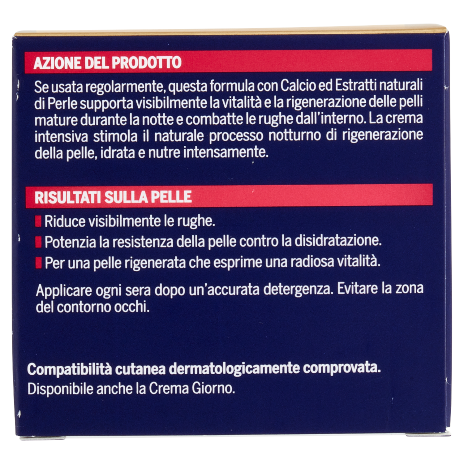 Azione del prodotto Se usata regolarmente, questa formula con Calcio ed Estratti naturali di Perle supporta visibilmente la vitalità e la rigenerazione delle pelli mature durante la notte e combatte le rughe dall'interno. La crema intensiva stimola il naturale processo notturno di rigenerazione della pelle, idrata e nutre intensamente. Risultati sulla pelle - Riduce visibilmente le rughe. - Potenzia la resistenza della pelle contro la disidratazione. - Per una pelle rigenerata che esprime una radiosa vitalità. Compatibilità cutanea dermatologicamente comprovata. Disponibile anche la Crema Giorno. Pelli mature Con il passare del tempo, la pelle si adatta a nuovi cicli biologici e diventa più incline alle rughe e agli altri segni del tempo. La cura in armonia con la pelle Questa formula, specificatamente studiata per le esigenze delle pelli mature, combina preziosi ingredienti e minerali: - Calcio: conosciuto per le sue capacità ricostituenti. - Estratti di Perle: ricchi di minerali essenziali e proteine nutrienti.