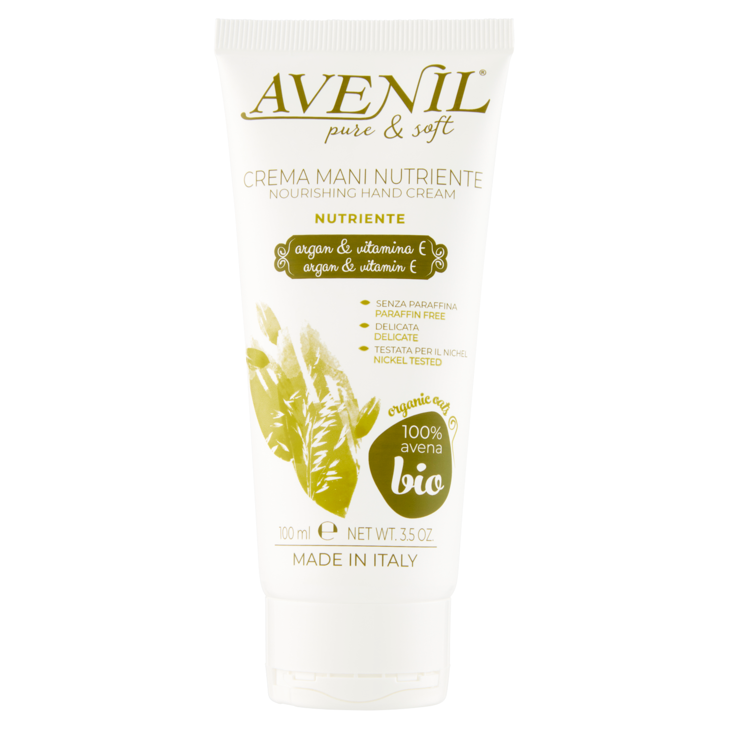 La Crema Mani Nutriente Avenil Pure & Soft grazie all'innovativa formula arricchita con Olio di Argan, Vitamina E e Avena* agisce attivamente nel restituire elasticità e protezione alla cute stressata delle mani. Non unta e di rapido assorbimento ridona il naturale equilibrio idro-lipidico e morbidezza alla pelle. *Formula con avena proveniente da agricoltura biologica