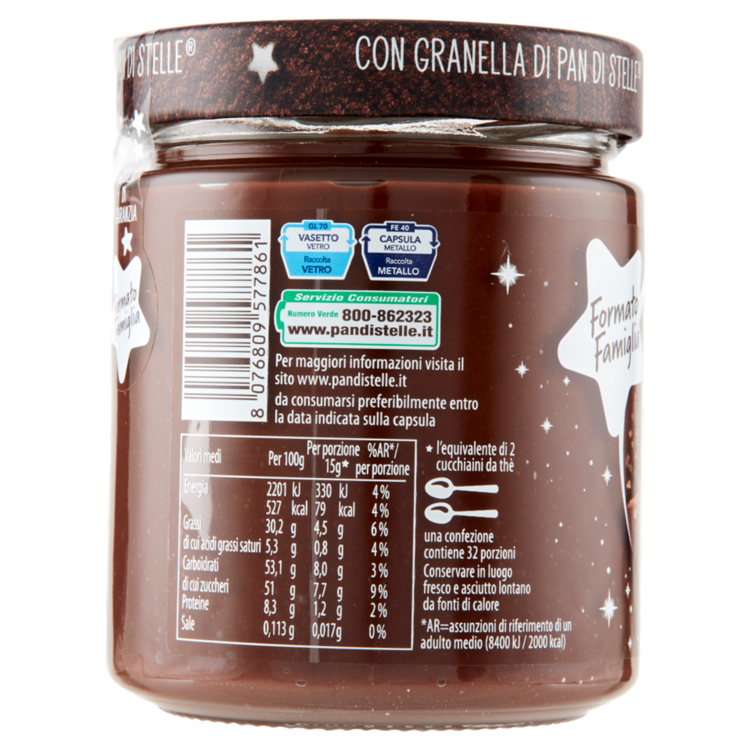 Granella di biscotto Pan di Stelle 2% [farina di frumento, zucchero, olio di girasole, burro, latte fresco pastorizzato alta qualità, cacao, cioccolato (pasta di cacao, zucchero, burro di cacao, aroma naturale vaniglia, emulsionante: lecitina di soia), uova fresche, miele, nocciole, amido di frumento, agenti lievitanti (carbonato acido di sodio, carbonato acido d'ammonio), sale, aromi, albume d'uovo in polvere, amido]