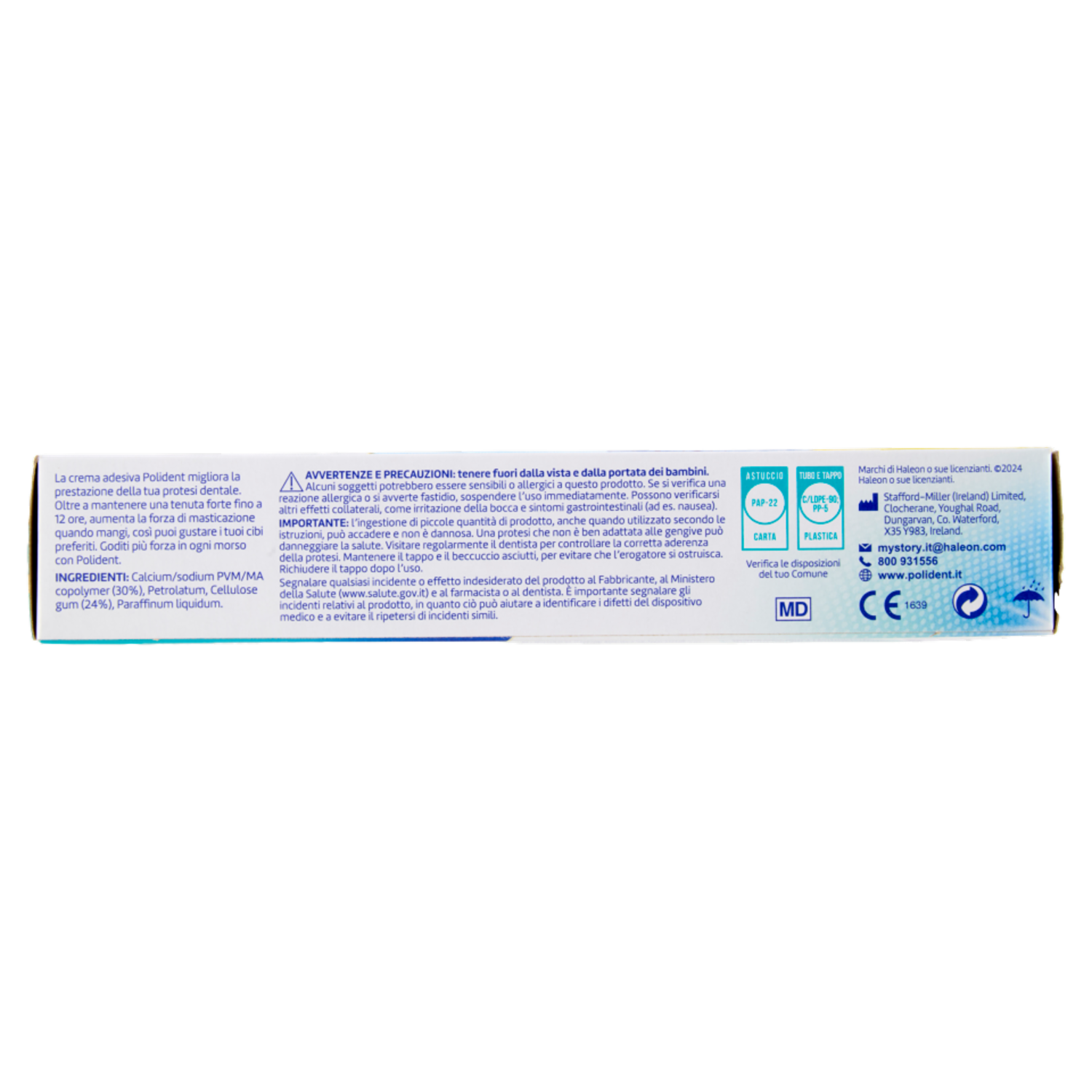 - Senza aromi artificiali e conservanti La crema adesiva Polident migliora la prestazione della tua protesi dentale. Oltre a mantenere una tenuta forte fino a 12 ore, aumenta la forza di masticazione quando mangi, così puoi gustare i tuoi cibi preferiti. Goditi più forza in ogni morso con Polident.