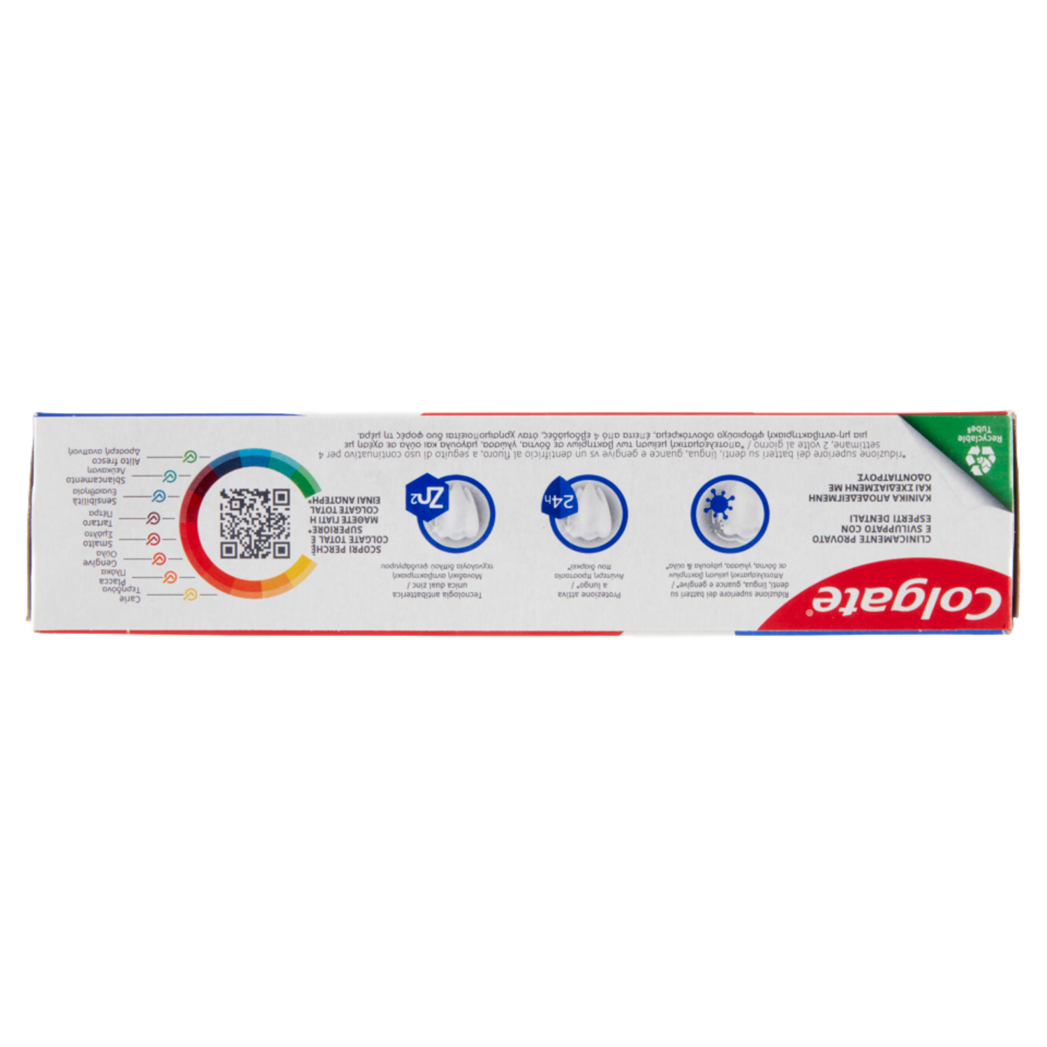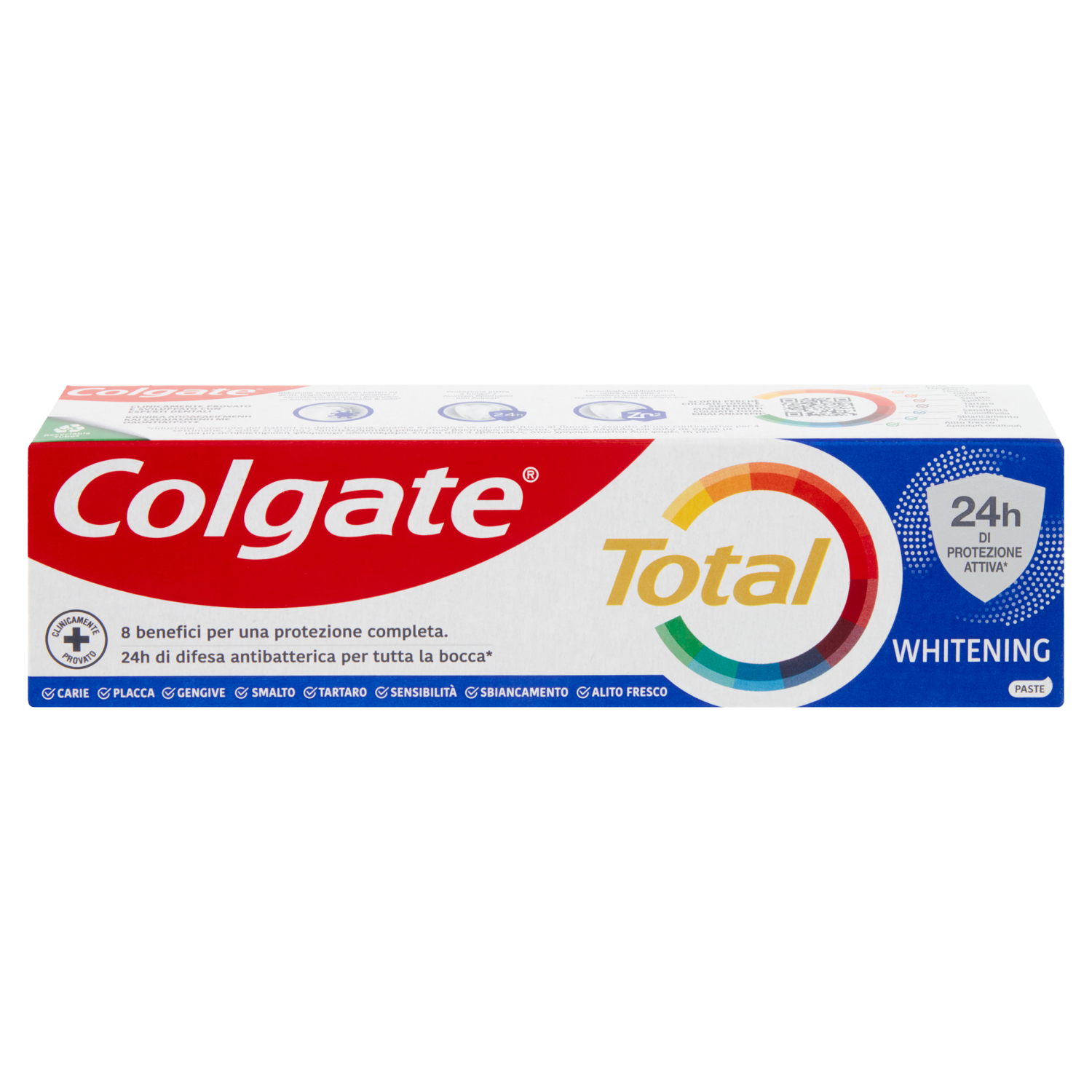 Clinicamente provato e sviluppato con esperti dentali Riduzione superiore dei batteri su denti, lingua, guance e gengive* Protezione attiva a lungo* Tecnologia antibatterica unica dual zinc Scopri perchè Colgate Total è superiore* - Carie - Placca - Gengive - Smalto - Tartaro - Sensibilità - Sbiancamento - Alito fresco *riduzione superiore dei batteri su denti, lingua, guance e gengive vs un dentifricio al fluoro, a seguito di uso continuativo per 4 settimane, 2 volte al giorno.
