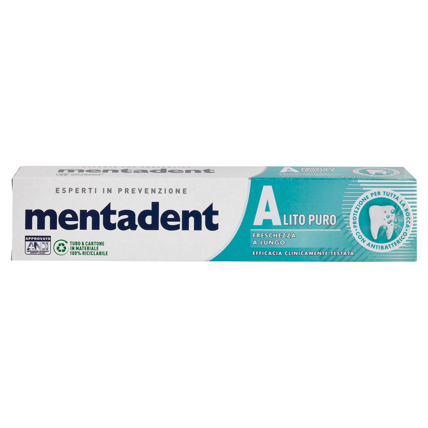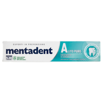 Mentadent Alito Puro combatte i batteri in tutta la bocca* proteggendo anche dall'alito cattivo. *Studio Clinico in vivo sulla riduzione dei batteri su denti, gengive, guance e lingua, dopo 14 e 28 giorni di utilizzo del prodotto. Da oggi con più zinc mineral: - Ingrediente attivo antibatterico di origine naturale - Assorbito gradualmente dalle gengive e rilasciato in tutta la bocca - Offre 18 ore di efficacia anti-placca - Efficacia clinicamente testata - Denti, gengive, guance e lingua sani Inoltre, contiene estratti naturali di menta per una freschezza di lunga durata. Approvato ANDI - Associazione Italiana Dentisti Italiani L'A.N.D.I. riconosce che un dentifricio al fluoro aiuta a prevenire la formazione della placca proteggendo la salute di denti e gengive. Mentadent Alito Puro soddisfa questi requisiti ed è quindi di significativa utilità, unito ad una sostituzione regolare dello spazzolino e ad un suo corretto utilizzo.