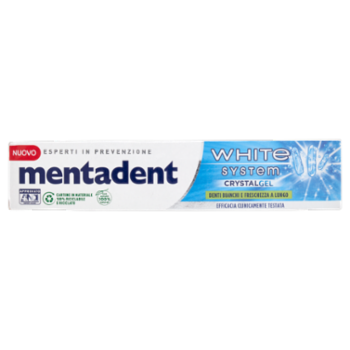 White System Denti bianchi e freschezza a lungo L'esclusiva formula di Mentadent White System Crystal Gel oltre a garantire la pulizia profonda di sempre, combina: Un gel alla menta fredda per un'intensa e duratura sensazione di freschezza. Particelle lucidanti che delicatamente donano splendore ai tuoi denti, per riaccendere il bianco del tuo sorriso. Il risultato: Un sorriso fresco e brillante! Davvero irresistibile! Approvato ANDI - Associazione Italiana Dentisti Italiani L'A.N.D.I. riconosce che un dentifricio al fluoro aiuta a prevenire la formazione della placca proteggendo la salute di denti e gengive. Mentadent White System Crystal Gel soddisfa questi requisiti ed è quindi di significativa utilità, unito ad una sostituzione regolare dello spazzolino e ad un suo corretto utilizzo. FDI FDI riconosce che lavarsi i denti almeno due volte al giorno con un dentifricio al fluoro, come Mentadent White System Crystal Gel, è di significativa utilità per una corretta igiene orale.