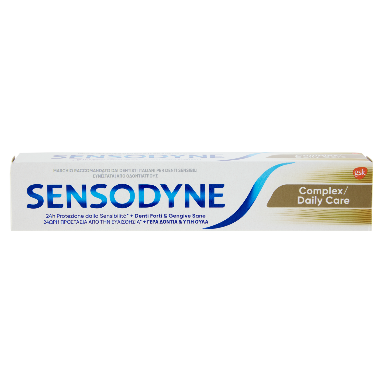 Perchè usare Sensodyne? È clinicamente provato che Sensodyne offre 24 ore di protezione dalla sensibilità* e tutti i benefici di un dentifricio quotidiano: denti forti, gengive sane e alito fresco. 24h Protezione dalla Sensibilità* + Denti Forti + Gengive Sane Usare Sensodyne Complex/ Daily Care due volte al giorno: - Offre protezione di lunga durata dalla sensibilità dentale - Contiene fluoro per proteggere dalla carie - Aiuta a controllare la formazione di placca - Aiuta a mantenere le gengive sane - Rinforza lo smalto - Dona una sensazione di freschezza e pulizia *usato due volte al giorno