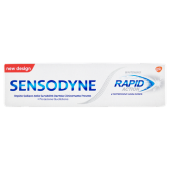 Cos'è la sensibilità dentale? La sensibilità dentale può presentarsi quando la dentina, solitamente protetta dallo smalto, diventa esposta. Quando la dentina esposta entra a contatto con bevande o cibi freddi o caldi, dolci o acidi, o perfino con lo spazzolino, il nervo può essere stimolato, causando una fitta di dolore breve e acuta. È clinicamente provato che Sensodyne Rapid Action Whitening allevia rapidamente il dolore dei denti sensibili. La sua formulazione agisce velocemente, creando una barriera sulle aree sensibili dei denti. Dona un rapido sollievo e fornisce una protezione continuativa ogni volta che spazzoli i denti. Aiuta a restituire il bianco naturale dei tuoi denti e a prevenire le macchie. Sensodyne Rapid Action Whitening è un dentifricio al fluoro che può essere usato tutti i giorni e che offre sollievo ai denti sensibili. Chiudi il rubinetto mentre lavi i denti Cartone riciclabile