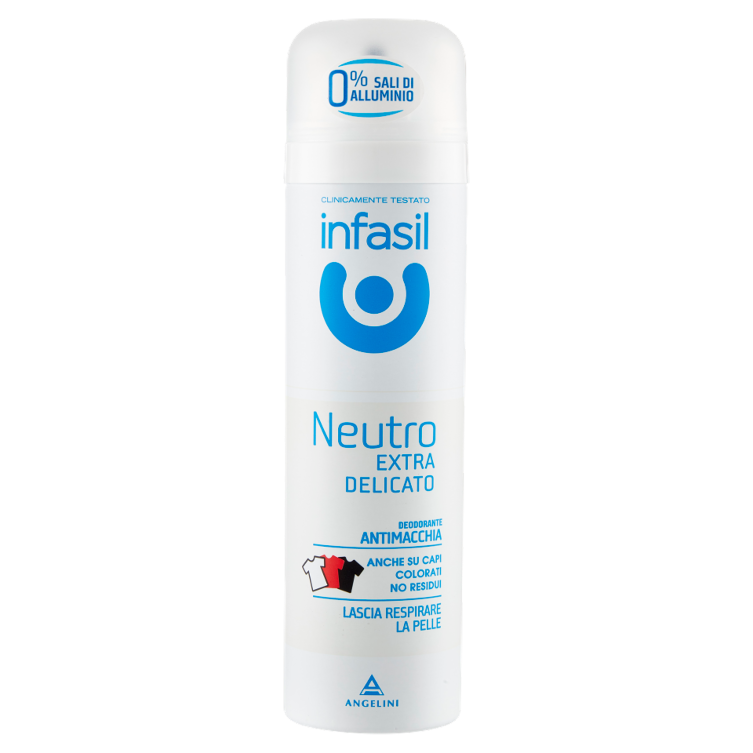 Dai Laboratori Farmaceutici Angelini nasce Infasil Neutro Extra Delicato, il deodorante che lascia respirare la pelle, con formula antimacchia no residui, anche su capi colorati. Test clinici dimostrano che la sua formula, con antibatterico naturale, è delicata sulla tua pelle e controlla gli odori, per una protezione deodorante che dura tutto il giorno. - Freschezza e sensazione di pulito per tutto il giorno. - Formula senza sali di alluminio: antimacchia no residui anche su capi colorati. - Con lo storico profumo di Infasil.