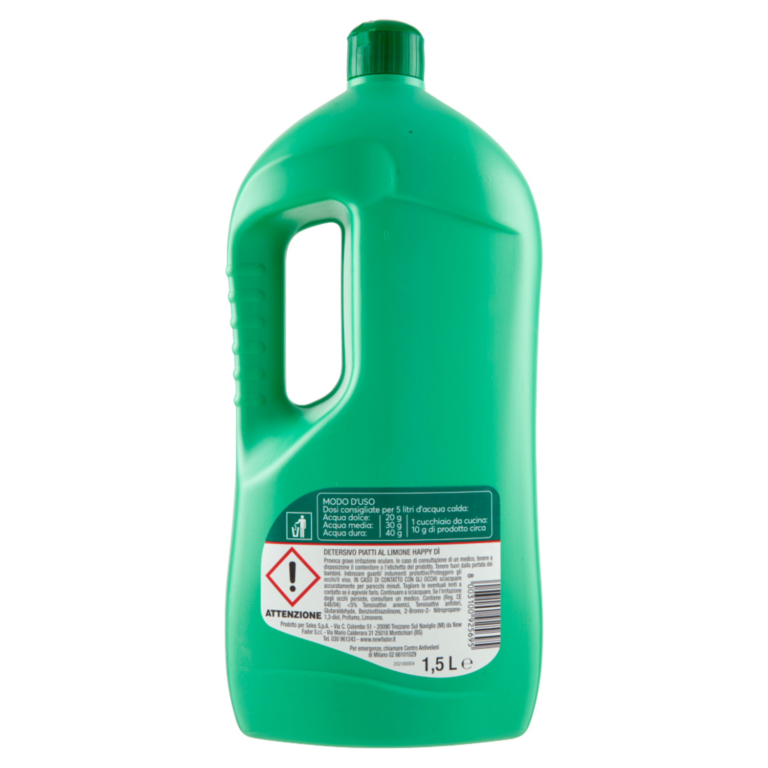 ATTENZIONE Detersivo piatti al limone Happy dì Provoca grave irritazione oculare. In caso di consultazione di un medico, tenere a disposizione il contenitore o l'etichetta del prodotto. Tenere fuori dalla portata dei bambini. Indossare guanti/ indumenti protettivi/Proteggere gli occhi/il viso. IN CASO DI CONTATTO CON GLI OCCHI: sciacquare accuratamente per parecchi minuti. Togliere le eventuali lenti a contatto se è agevole farlo. Continuare a sciacquare. Se l'irritazione degli occhi persiste, consultare un medico. Per emergenze, chiamare Centro Antiveleni di Milano 02 66101029