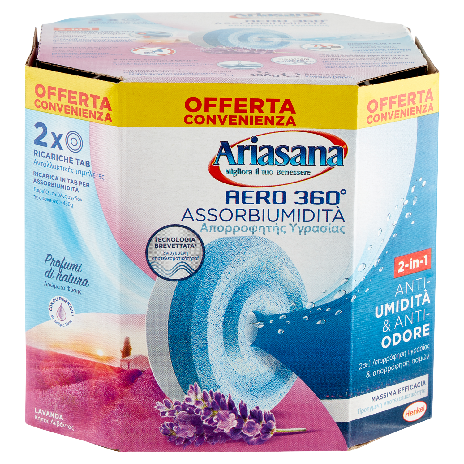 2-in-1 Anti-umidità Massima efficacia La superficie ondulata (brevettata) e il foro centrale favoriscono un maggior contatto con l'aria, la composizione di cristalli attivi garantisce un ottimale assorbimento dell'umidità. Anti-odore Tecnologia brevettata Riduzione attiva dei cattivi odori grazie alla tecnologia anti-odore brevettata presente all'interno della Tab. Cattura e neutralizza i cattivi odori. Profumi di natura Esplora la magia della natura a casa tua Usando questa delicata e rilassante fragranza potrai rivivere la magia dei campi di lavanda a casa tua. Arricchito con oli essenziali provenienti dalla Francia. Come funziona Aero 360? 1. Il sistema Aero 360° assorbe l'umidità in eccesso e neutralizza i cattivi odori grazie all'esclusivo sistema di circolazione dell'aria a 360° e alla tecnologia 2-in-1 delle ricariche Tab Aero 360°, con azione anti-odore brevettata. 2. La Tab Aero 350° converte l'umidità in soluzione salina. 3. La soluzione salina si deposita alla base del Kit. Sistema Aero 360° Per ottenere la massima efficacia possibile, utilizzare la Tab Aero 360° con il dispositivo Aero 360°. 2-in-1 Tecnologia tab 2-in-1 1. Massima efficienza nell'assorbire l'umidità. 2. Tecnologia anti-odore brevettata. Fino a 3 ore - Massima durata - Ogni ricarica dura fino a 3 mesi in una stanza di 55m³.** Azione extra veloce - Prima goccia dopo 6h.** *Tecnologia brevettata - Superficie ondulata per un maggior contatto con l'aria e tecnologia anti-odore. Ricarica in tab - Ricarica in Tab compostabile con i dispositivi ≥ 450g. **In base alla temperatura e al grado di umidità della stanza.