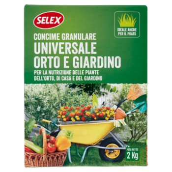 Il Concime Granulare Universale Orto e Giardino Selex, ha larghissima destinazione d'uso in grado di fornire a ogni tipo di pianta il necessario e giusto apporto nutritivo, favorendo una crescita omogenea e bilanciata. È ideale da utilizzare su orti, aiuole da fiore, cespugli, siepi, piante da frutta, alberi ornamentali, conifere, prati; può essere utilizzato per la concimazione di pre-semina (2-3 settimane prima della semina interrandolo durante la preparazione del terreno) e per la concimazione di copertura, a intervalli variabili a seconda della coltura e del tipo di terreno.