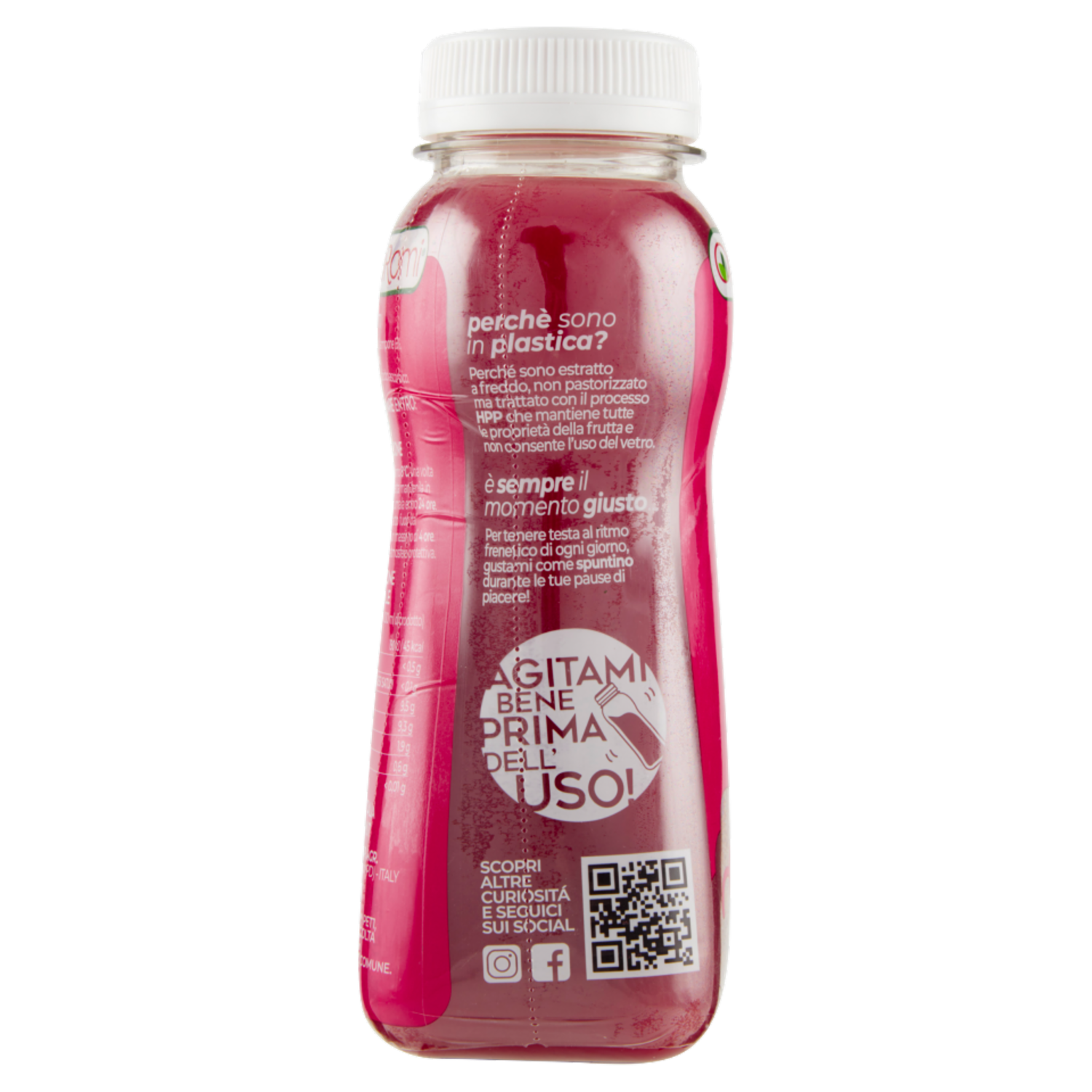 100% Frutta estratta a freddo non sono un succo cotto pastorizzato! perchè sono in plastica? Perché sono estratto a freddo, non pastorizzato ma trattato con il processo HPP che mantiene tutte le proprietà della frutta e non consente l'uso del vetro. è sempre il momento giusto... Per tenere testa al ritmo frenetico di ogni giorno, gustami come spuntino durante le tue pause di piacere!