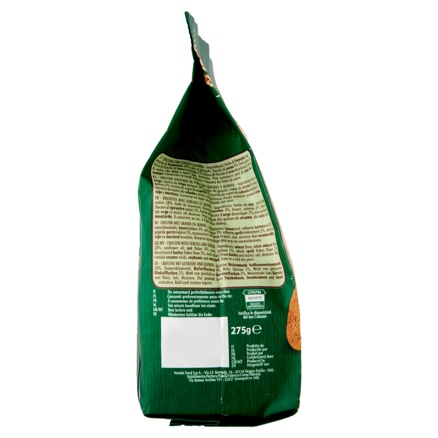 Mondo Benessere Alla base del benessere c'è uno stile di vita sano ed equilibrato, senza rinunciare al gusto. Buono e croccante Scopri il gusto rustico e leggero di Crostino Dorato Multicereali, sottile fettina croccante e versatile. Una ricetta semplice che, grazie all'apporto nutrizionale di cereali integrali, avena e quinoa, rende Crostino Dorato Multicereali ricco di fibre, leggero e con tanto gusto. Crostino Dorato Multicereali è preparato con ingredienti accuratamente selezionati e tostato a lenta cottura per una doratura uniforme ed una croccantezza irresistibile. Ottimi a tavola, come aperitivo e sfiziosi fuori pasto Crostino Dorato Multicereali è un'alternativa al pane sana, gustosa e croccante. Provali a tavola, come aperitivo o come snack leggero e sfizioso!