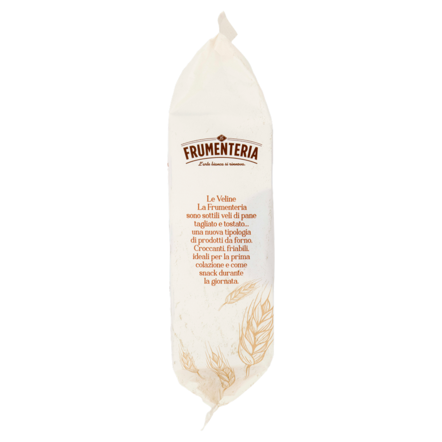 La lenta preparazione delle veline Alla sera impastiamo la biga fatta di acqua, farina e lievito e andiamo a casa lasciandola riposare sino alle prime ore del mattino. Prima dell'alba torniamo, controlliamo l'impasto, che durante la notte raddoppia di volume, e aggiungiamo gli altri ingredienti. Lo rimpastiamo nuovamente e lo lasciamo riposare ancora un po'. Poi procediamo alla formatura dell'impasto, che viene diviso in pani adagiati all'interno di stampi, dove rimarranno fino al termine della lievitazione. Cuociamo i filoni negli stampi fino a renderli soffici e profumati. Ma non è mica finita qui! Mettiamo i filoni cotti a riposare per equilibrare l'umidità interna (mollica) ed esterna (crosta) per ottenere quella croccantezza e fragranza caratteristica delle nostre Veline. Questo processo richiede almeno un'altra notte di pazienza. Al termine di questa lunga attesa, tagliamo i filoni in sottili fette che, tostate per alcuni minuti, diventano finalmente Le Veline. Le confezioniamo immediatamente per mantenere intatti la qualità e il gusto nati da giorni di passione e pazienza. Le Veline La Frumenteria sono sottili veli di pane tagliato e tostato.. una nuova tipologia di prodotti da forno. Croccanti, friabili, ideali per la prima colazione e come snack durante la giornata.