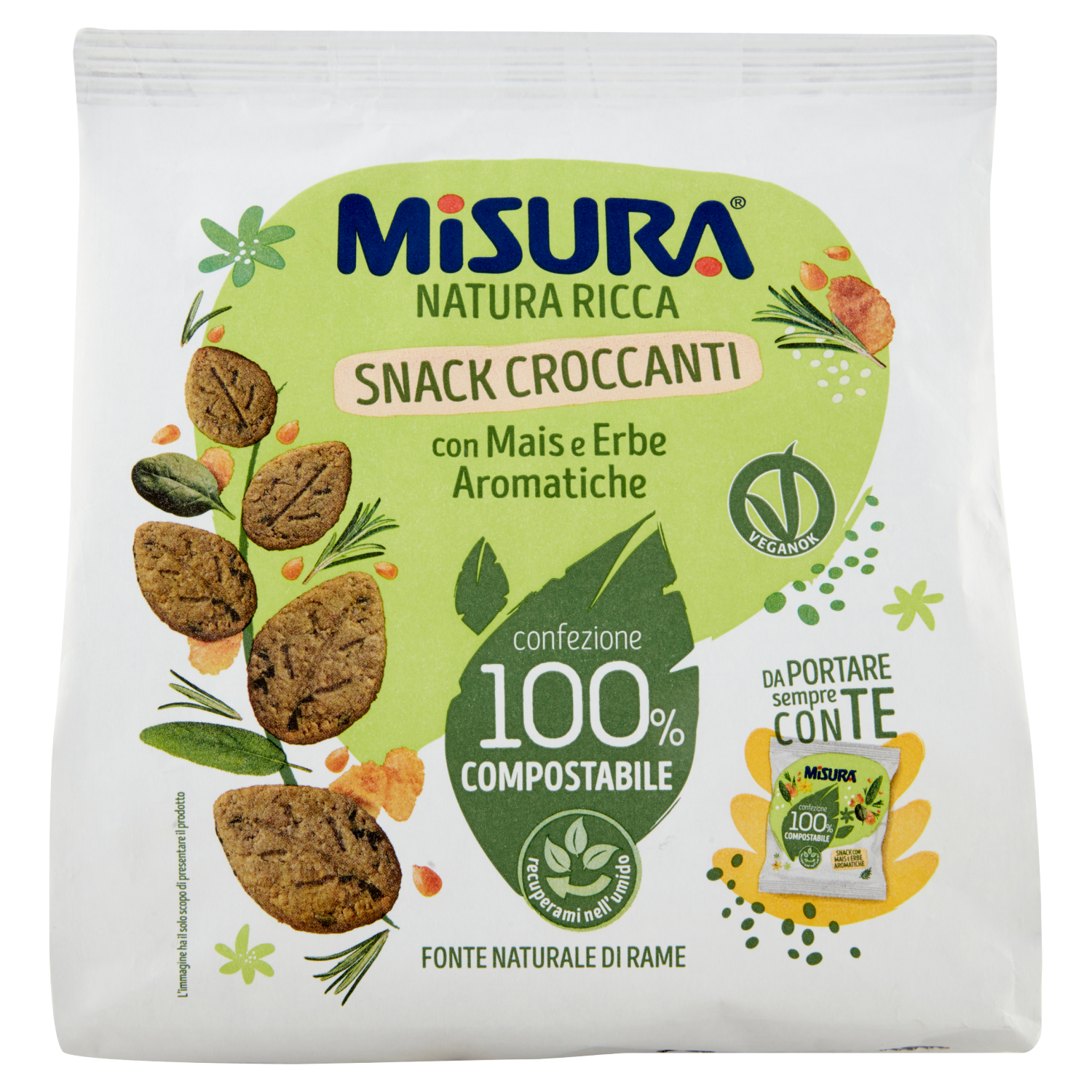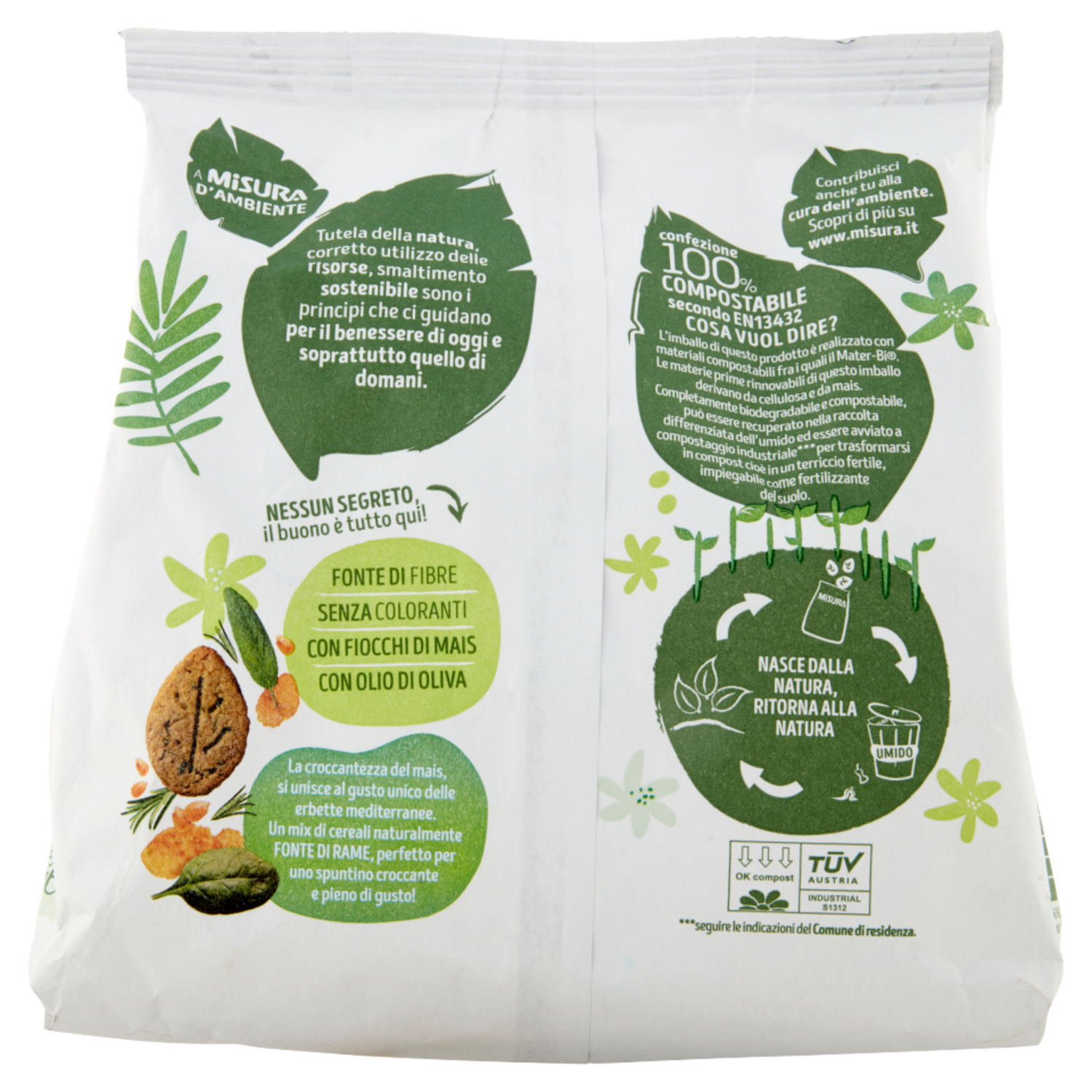 A misura d'ambiente Tutela della natura, corretto utilizzo delle risorse, smaltimento sostenibile sono i principi che ci guidano per il benessere di oggi e soprattutto quello di domani. confezione 100% Compostabile secondo EN13432 Cosa Vuol Dire? L'imballo di questo prodotto è realizzato con materiali compostabili fra i quali il Mater-Bi. Le materie prime rinnovabili di questo imballo derivano da cellulosa e da mais. Completamente biodegradabile e compostabile, può essere recuperato nella raccolta differenziata dell'umido ed essere avviato a compostaggio industriale***per trasformarsi in compost cioè in un terriccio fertile, impiegabile come fertilizzante del suolo. ***seguire le indicazioni del Comune di residenza. Contribuisci anche tu alla cura dell'ambiente. Scopri di più su www.misura.it. Nessun Segreto, il buono è tutto qui! Fonte di fibre Senza coloranti Con fiocchi di mais Con olio di oliva La croccantezza del mais, si unisce al gusto unico delle erbette mediterranee. Un mix di cereali naturalmente Fonte di Rame, perfetto per uno spuntino croccante e pieno di gusto! Ricette buone, semplici e trasparenti