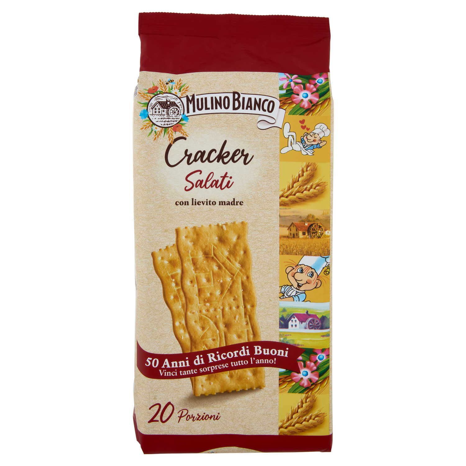La Carta del Mulino Ogni Cracker di questa confezione contiene farina di grano tenero ottenuta nel rispetto della Carta del Mulino, il disciplinare di coltivazione sostenibile redatto insieme al WWF che porta qualità nei prodotti, supporta il lavoro della comunità di agricoltori e protegge la biodiversità favorendo anche gli insetti impollinatori. Con farina di grano tenero da agricoltura sostenibile La Carta del Mulino prevede il rispetto dei criteri di sostenibilità ISCC Plus ed è stata scritta insieme al WWF e al Dipartimento di Scienze e Tecnologie Agro-Alimentari dell'Alma Mater Studiorum - Università di Bologna. Scopri di più su mulinobianco.it/lacartadelmulino Tutto il buono che senti Farina di frumento + lievito madre + sale I Cracker Salati nascono dall'unione di farina di frumento e lievito madre. La naturale lievitazione di 24h e la spolverata di granelli di sale in superficie donano ai Cracker Salati la loro caratteristica croccantezza e il loro sapore semplice ma inconfondibile. mulinobianco.it 24 Ore di lievitazione naturale