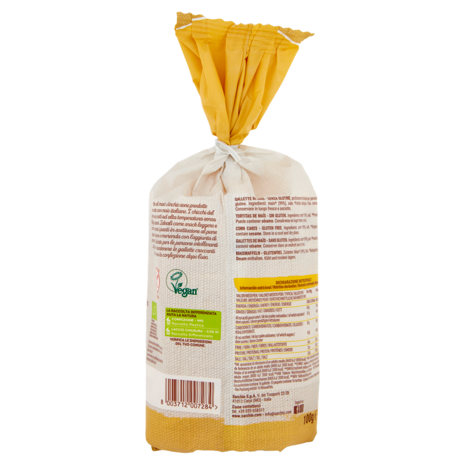 Le gallette di mais Sarchio sono prodotte esclusivamente con mais italiano. I chicchi del cereale vengono cotti ad alta temperatura senza l'aggiunta di grassi. Ideali come snack leggero e croccante, durante i pasti in sostituzione al pane oppure a colazione o merenda con l'aggiunta di marmellata. Indicate per le persone intolleranti al glutine. Per mantenere le gallette croccanti richiudere bene la confezione dopo l'uso.