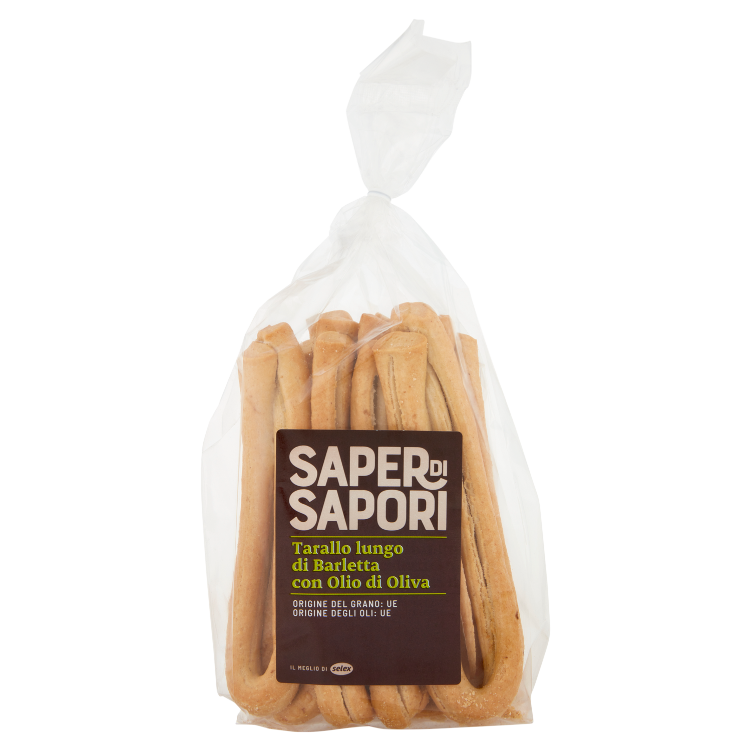 Tarallo lungo con olio di oliva 12% e olio extra vergine di oliva 3,7%. Prodotto da forno