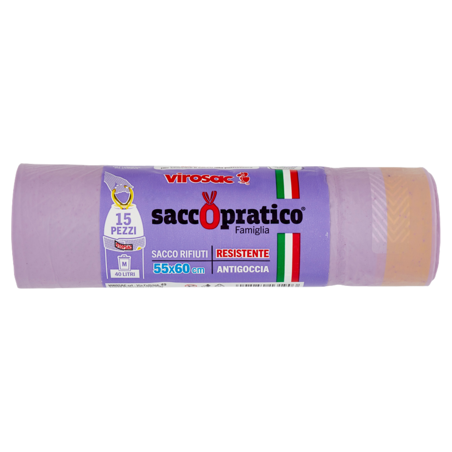 I nostri plus: 1) Con maniglie estraibili 2) Dotato di fermasacco 3) Prod otto con materiale riciclato 4) Prodotto riciclabile 5) Saldatura antigocci a 6) Superforte