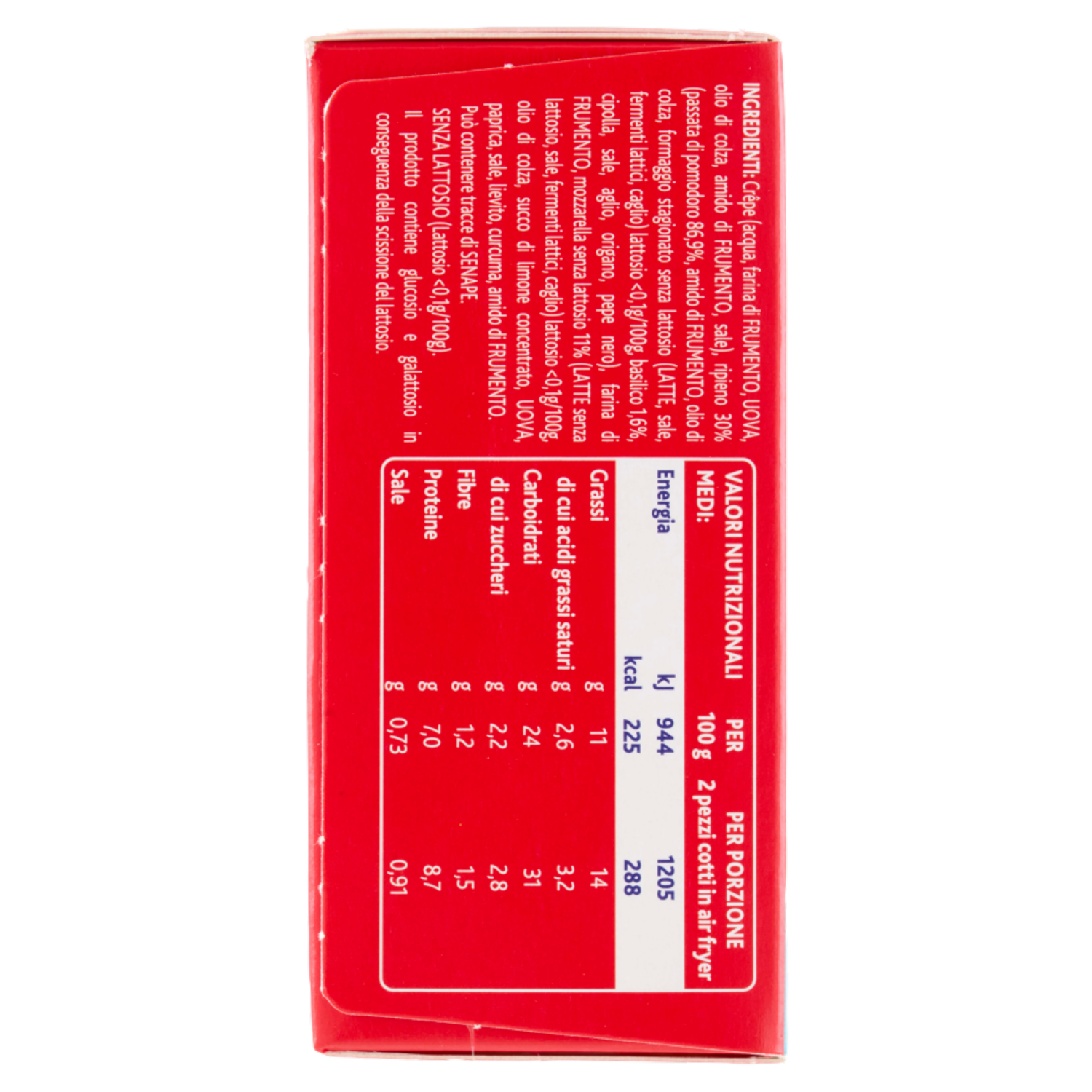 Ripieno 30,8% (passata di pomodoro 86,9%, amido di frumento, olio di colza, formaggio stagionato senza lattosio (latte, sale, fermenti lattici, caglio) lattosio <0,1g/100g, basilico 1,6%, cipolla, sale, aglio, origano, pepe nero)