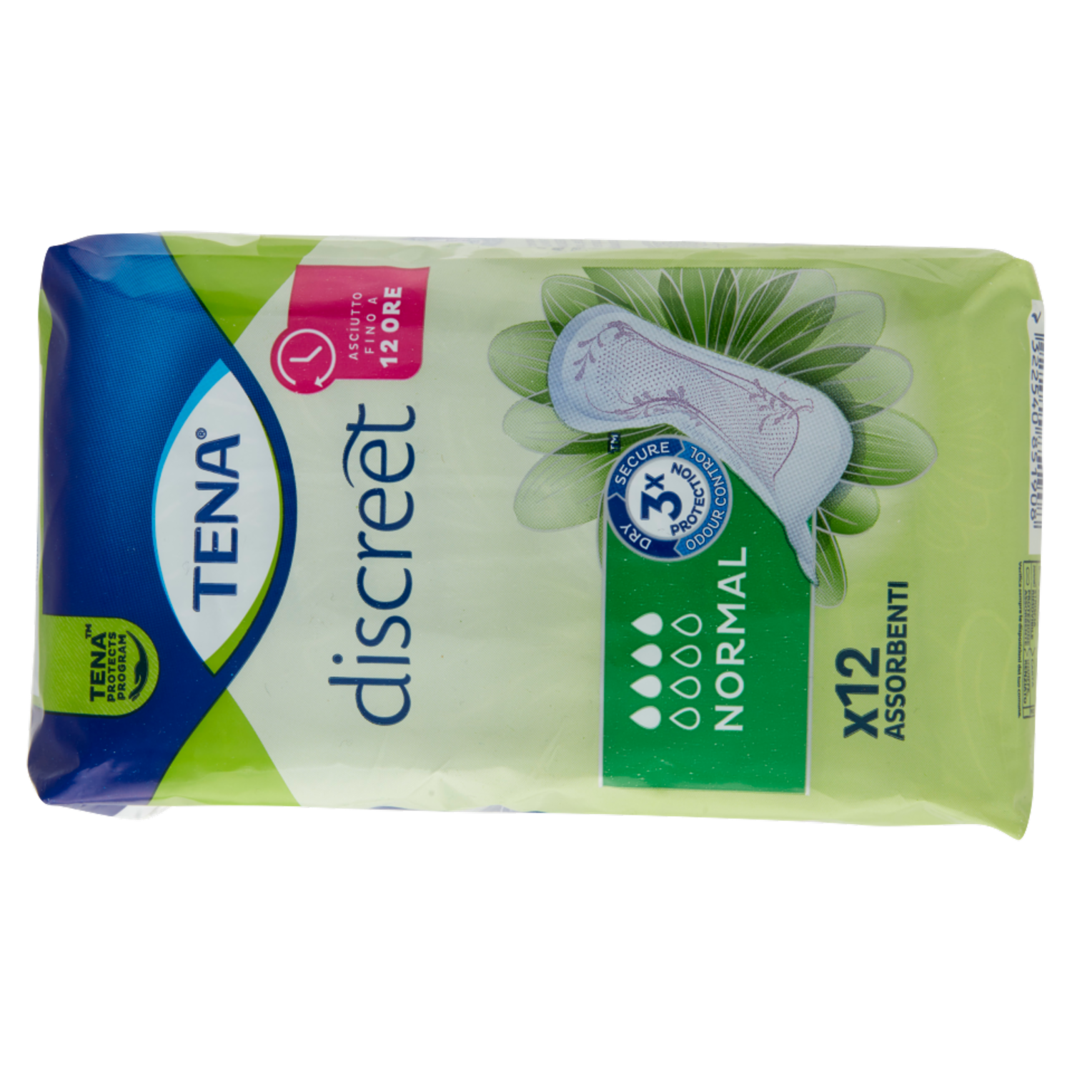 Tena Discreet ti offre Tripla Protezione da perdite, odori e sensazione di bagnato sulla pelle. Tena Discreet Normal per perdite urinarie da leggere a moderate offre una protezione sicura e discreta, lasciandoti asciutta fino a 12 ore. Grazie alla tecnologia microProtex, assorbe velocemente perdite e odori, così che tu possa sentirti asciutta e a tuo agio.